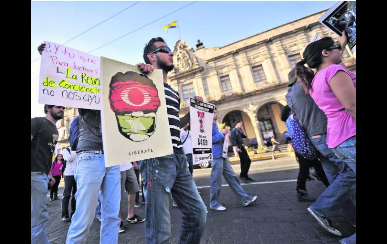 Jalisco | Participaron aproximadamente 100 personas Protestan contra el nuevo Gobierno Miembros del Frente Amplio Progresista y otros tantos de #YoSoy132GDL marcharon desde el parque de la Revolución a la Plaza de Armas Por: EL INFORMADOR 3 de marzo de 2013 - 02:30 hs Manifestantes frente a la Presidencia Municipal de Guadalajara, rumbo a Plaza de Armas. EL INFORMADOR / GUADALAJARA, JALISCO (03/MAR/2013).- Miembros del Frente Amplio Progresista y de la organización #YoSoy132GDL protestaron en una marcha pacífica contra el regreso del Partido Revolucionario Estatal (PRI) al Gobierno del Estado un día después de que el emanado de ese instituto político, Aristóteles Sandoval, tomara posesión como gobernador de Jalisco, suceso que transcurrió con un fuerte operativo de seguridad en el primer cuadro de la ciudad. Cerca de 100 personas caminaron por Avenida Vallarta, Enrique Díaz de León e Hidalgo desde el Parque Revolución hasta la Plaza de Armas, custodiados por una docena de patrullas tapatías y algunos policías en motocicleta. Al término de la manifestación, la organización #YoSoy132GDL expresó a través de su cuenta en Twitter: “Termina la marcha informativa ciudadana sin mayores incidentes. No callarán nuestras voces. La lucha sigue”. El pasado 1 de diciembre, alrededor de 500 personas se manifestaron contra la asunción del priista Enrique Peña Nieto como Presidente de México en los alrededores de Expo Guadalajara. La marcha terminó en enfrentamiento con decenas de detenidos. Días después fueron liberados 25 jóvenes, algunos de los cuales se identificaron como parte del movimiento #YoSoy132. A diferencia de la del 1 de diciembre, la manifestación de ayer transcurrió sin incidentes de consideración. Temas Manifestaciones en Jalisco Gobierno del Estado Aristóteles Sandoval #YoSoy132 Lee También Astros de Jalisco toma ventaja sobre Xalapa en la semifinal de zona Detienen a presunto homicida en Lomas de Oblatos Puerto Vallarta es reconocida como la mejor ciudad pequeña de Latinoamérica Suspenden clases en estos 9 municipios de Jalisco ante el paso de tormenta tropical 'Raymond' Recibe las últimas noticias en tu e-mail Todo lo que necesitas saber para comenzar tu día Registrarse implica aceptar los Términos y Condiciones