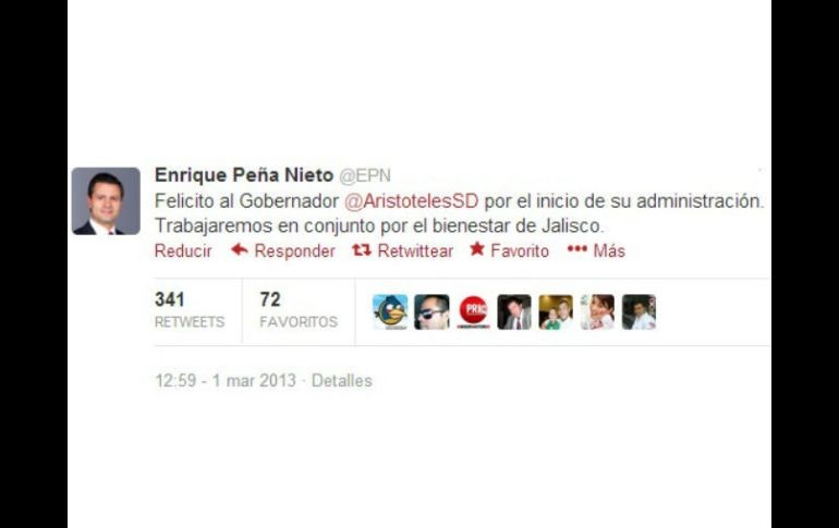 Jalisco | Movimiento Ciudadano ofrece respeto y espera resultados Reacciones tras la toma de protesta de Aristóteles Sandoval Correligionarios, opositores y autoridades educativas expresan su punto de vista sobre el cambio de gobernador Por: EL INFORMADOR 2 de marzo de 2013 - 03:29 hs Enrique Peña Nieto felicitó a Aristóteles vía Twitter. ESPECIAL / GUADALAJARA, JALISCO (02/MAR/2013).- Declaraciones y mensajes en las redes sociales sirvieron para que personalidades de la vida política manifestaran su posición respecto al nuevo gobernador Vía Twitter Enrique Peña Nieto, Presidente de México. “Felicito al Gobernador @AristotelesSD por el inicio de su administración. Trabajaremos en conjunto por el bienestar de Jalisco” El gobernador, en uno de sus cinco tuits del día. “Agradezco la felicitación de nuestro Presidente @EPN. Con su apoyo y compromiso transformaremos Jalisco” OFRECEN COLABORAR Miguel Ángel Monraz, presidente del PAN en Jalisco. “El PAN está obligado a ser una oposición responsable; entendimos el mensaje de los ciudadanos, que buscaban alternancia; quedamos a deber en muchos aspectos” Hugo Luna Vázquez, presidente de Movimiento Ciudadano en Jalisco. “Habrá respeto absoluto al Gobierno, esperaremos los resultados de la gestión que prometieron; no vamos a permitir abusos, ni convalidaremos absurdos” GESTOS DE APOYOTonatiuh Bravo Padilla, rector general electo de la UdeG. “Lo que requiere ahorita el Gobierno es darle valor agregado a la sociedad (..) Vamos a trabajar para superar los escollos financieros de la Universidad” Temas Gobierno del Estado Aristóteles Sandoval Redes Sociales Toma de protesta Recibe las últimas noticias en tu e-mail Todo lo que necesitas saber para comenzar tu día Registrarse implica aceptar los Términos y Condiciones