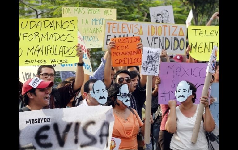 Jalisco | Exigen eliminar la manipulación política de los medios de comunicación Regresa #YoSoy132 a las calles del país y al proceso electoral En Guadalajara, alrededor de 200 jóvenes reunidos efectuaron una marcha partiendo de Avenida Chapultepec y a su paso, mientras gritaban consignas y rechazaban otra vez al candidato presidencial priista Enrique Peña Nieto Por: EL INFORMADOR 24 de mayo de 2012 - 03:20 hs Unos mil jóvenes se encaminaron para manifestarse afuera de la emisora local de Televisa. EFE / GUADALAJARA, JALISCO (24/MAY/2012).- Los jóvenes universitarios irrumpieron otra vez en las calles y en el proceso electoral con la marcha convocada bajo el identificador de redes sociales #YoSoy132. En Guadalajara, alrededor de 200 jóvenes reunidos efectuaron una marcha partiendo de Avenida Chapultepec y a su paso, mientras gritaban consignas en las que exigían eliminar la manipulación política de los medios de comunicación y rechazaban otra vez al candidato presidencial priista Enrique Peña Nieto, reunieron más adeptos hasta llegar casi mil de ellos a la sede de la empresa Televisa, en la Colonia Moderna, donde insistieron en sus reclamos; de ahí se trasladaron a las instalaciones del periódico Milenio, siempre custodiados por policías viales y de Guadalajara. Mientras tanto, en la capital del país una marcha paralela eligió como punto de partida la Estela de Luz, el monumento que se ha convertido en un símbolo de la corrupción. Estudiantes de la UNAM, de la Universidad Autónoma Metropolitana, del Politécnico y de otras instituciones privadas reiteraron su apoyo al movimiento que nació en la Universidad Iberoamericana; se estima que se reunieron alrededor de 15 mil jóvenes provenientes de 15 universidades con sede en el Distrito Federal. Esta vez, sin embargo, la protesta contra la empresa televisora y contra los partidos políticos adquirió un nuevo nivel, pues los miembros de #YoSoy132 hicieron públicas una serie de peticiones, entre las que destaca la exigencia de que el segundo debate entre candidatos presidenciales (se celebrará el 10 de junio en Guadalajara) se transmita en cadena nacional en las televisoras. Temas Manifestaciones en Jalisco Municipios Medios de comunicación #YoSoy132 Lee También ¿Qué exigen los productores de maíz? Aquí te decimos EN VIVO: Maiceros bloquean carretera Guadalajara-Morelia Liberan carretera Guadalajara-Morelia tras bloqueo de maiceros Así se ve la carretera Guadalajara-Morelia en cámaras del C5 tras bloqueo Recibe las últimas noticias en tu e-mail Todo lo que necesitas saber para comenzar tu día Registrarse implica aceptar los Términos y Condiciones