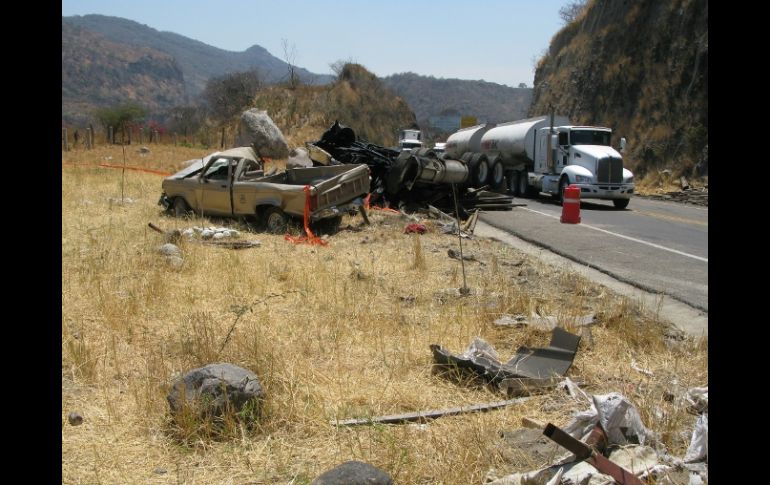 Jalisco | Hubo dos fallecidos y 11 más quedaron heridos Reportan saldo mortal en accidente carretero en Tuxpan El percance ocurrió sobre la Autopista Guadalajara–Colima, a la altura del kilómetro 111 Por: EL INFORMADOR 4 de abril de 2011 - 10:38 hs Bomberos informaron de la muerte de dos personas en el choque múltiple en vía a Colima. M. PATIÑO / TUXPAN, JALISCO (04/ABR/2011).- Una carambola ocasionada por un tráiler que cargaba tubos de acero para riego, provocó la muerte de dos hombres y lesiones a 11 personas más, así como pérdidas materiales en más de 10 vehículos. El percance ocurrió sobre la Autopista Guadalajara–Colima, a la altura del kilómetro 111, dentro del municipio de Tuxpan, Jalisco, en los límites con el Estado de Colima. El chofer del carguero circulaba por la citada vía con rumbo hacia Colima, y al llegar a altura del puente conocido como Atenquique, perdió el control del carguero, ya que aparentemente circulaba a exceso de velocidad, por lo que al llegar hasta dicho punto, varios vehículos se encontraban circulando a baja velocidad, ya que en la zona realizaban reparaciones a otro puente. Por lo que impactó a 11 vehículos, entre los que se encuentras autos compactos y camionetas, dejando como saldo 11 personas lesionadas y dos más, fallecidas. Los dos hombres que perdieron la vida respondían a los nombres de José Manuel Jiménez González, de 19 años de edad, quien viajaba a bordo de una camioneta tipo pick up, marca Ford Ranger, de modelo atrasado, en color café, con placas de circulación JF-83953, de esta Entidad. En tanto que, el otro fallecido fue identificado como Hilario Jiménez Sígala de 83 años, quien se transportaba a bordo de un taxi con placas de circulación 2883-GMF, del Estado de Jalisco. Temas Seguridad Accidentes con muertes en Jalisco Protección Civil Jalisco Lee También Policía de Zapopan realiza cinco detenciones en una semana Lluvias dejan 29 muertos en un día en México Astros de Jalisco doblega a Xalapa y se pone a un juego de la Final de Zona Escuela Gómez de Mendiola celebra sus primeros 75 años al servicio de los tapatíos Recibe las últimas noticias en tu e-mail Todo lo que necesitas saber para comenzar tu día Registrarse implica aceptar los Términos y Condiciones
