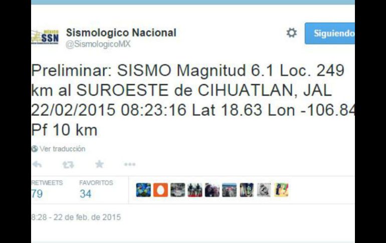 Jalisco | Hasta el momento no se registran daños en los municipios aledaños a Cihuatlán Se registra sismo de 6.1 grados en Costas de Jalisco Hasta el momento no se registran daños en los municipios aledaños a Cihuatlán Por: EL INFORMADOR 22 de febrero de 2015 - 07:57 hs El sismo se registró a las 08:23 horas de este día. No se reportan daños hasta el momento. TWITTER / @SismologicoMX GUADALAJARA, JALISCO (22/FEB/2015).- Según informes preliminares del Sismológico Nacional, a las 08:23 de este día se registró un sismo de 6.1 de magnitud en la escala de Richter con epicentro en Cihuatlán. Ante el movimiento telúrico, la Unidad de Protección Civil y Bomberos de Jalisco informó a través de su cuenta de Twitter que se realizará monitoreo en los munIcipios aledaños para descartar daños o posibles réplicas y alertar a la población. Por su parte, el Jefe de Gobierno de Gobierno del Distrito Federal, Miguel Ángel Mancera publicó que no se tuvo percepción de este sismo en aquella ciudad. Hasta el momento, el Sismológico Nacional ha informado de dos réplicas minutos después de las 08:23, la primera de 6.3 y la segunda de 5.5 ambas no han sido consideradas para posible tsunami. El Coordinador Nacional de Protección Civil de la Secretaría de Gobernación, Luis Felipe Puente dijo que el sismo fue sentido ligeramente en algunas zonas de Jalisco e imperceptible en Michoacán y Ciudad de México. Protección Civil de Jalisco informó más tarde que el sismo se sintió de manera leve en Cihuatlán, El Limón, Tomatlán, Zapotlán el Grande, San Gabriel y Sayula, todos sin afectaciones. Cabe recordar que el pasado 12 de febrero se registró otro sismo similar pero en aquella ocasión fue de magnitud 5.2 y no se tuvo daños. EL INFORMADOR / CAROLINA QUINTANILLA Temas Municipios de la Costa de Jalisco Sismos nacional Municipios Protección Civil Jalisco Lee También Puerto Vallarta es reconocida como la mejor ciudad pequeña de Latinoamérica Suspenden clases en estos 9 municipios de Jalisco ante el paso de tormenta tropical 'Raymond' Clausuran centro de rehabilitación en Tonalá por posibles delitos Viernes de tormentas en Guadalajara; aparecerán a esta hora Recibe las últimas noticias en tu e-mail Todo lo que necesitas saber para comenzar tu día Registrarse implica aceptar los Términos y Condiciones