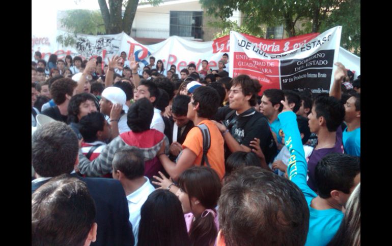 Jalisco | Hoy el Sindicato Único de Trabajadores decide si se van a paro de labores Sorprende UdeG con marcha de esta mañana Estudiantes de la 'prepa' 8 se congregarán en Casa Jalisco, pese a que la Universidad esperaría a la megamarcha para realizar otra movilización Por: EL INFORMADOR 27 de septiembre de 2010 - 09:21 hs Aspecto de estudiantes de la UdeG en protesta. R. ZAPATA / La relación UdeG y Gobiernoes la más deteriorada: CortésGUADALAJATA, JALISCO (27/SEP/2010).- Personal de Prensa y Comunicación de la Universidad de Guadalajara ( UdeG) confirma que esta mañana estudiantes de la Preparatoria 8 de la casa de estudios se concentrarán afuera de Casa Jalisco para continuar la campaña de presión para que el Gobierno del Estado otorgue más recursos a la UdeG. Desde el pasado jueves, los líderes de la UdeG habían decidido suspender esta misma marcha prevista para el pasado viernes, con el propósito de concentrar sus esfuerzos en la organización de la megamarcha del próximo miércoles 29. Con esta sería la décimo segunda marcha que la casa de estudios realiza en los últimos 26 días. Esta mañana, el Sindicato Único de Trabajadores de la UdeG decidiría si la Universidad se iría al paro de labores. EL INFORMADOR / RAFAEL ZAPATA Temas Manifestaciones en Jalisco Gobierno del Estado UdeG Presupuesto UdeG Recibe las últimas noticias en tu e-mail Todo lo que necesitas saber para comenzar tu día Registrarse implica aceptar los Términos y Condiciones