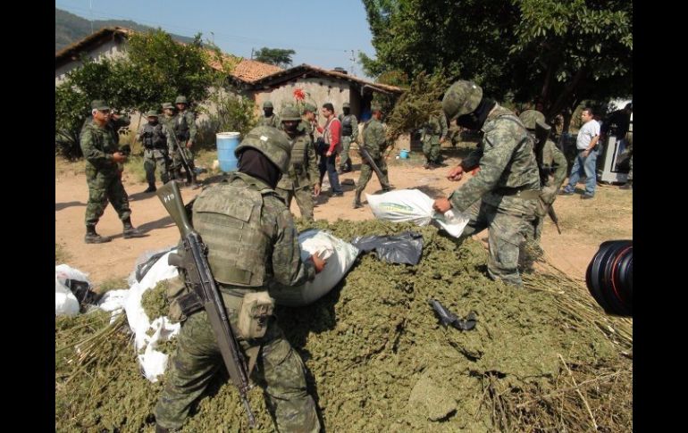 Jalisco | Soldados ya habían decomisado tonelada y media en una narcogranja Suman 15 las toneladas de mariguana aseguradas en Mixtlán Soldados ya habían decomisado tonelada y media en una narcogranja Por: EL INFORMADOR 23 de noviembre de 2011 - 19:09 hs Personal militar realizó operativos de seguridad en el poblado de La Laja en el municipio de Mixtlán. / GUADALAJARA, JALISCO (23/NOV/2011).- Tras el aseguramiento de una ''narcogranja'' en el poblado de La Laja del municipio de Mixtlán, donde personal miltar decomisó tonelada y media de mariguana, continuó con los operativos asegurando en otras dos fincas 13 toneladas y media más del mismo enervante, dando un total de 15 toneladas, tras el despliegue de las fuerzas castrenses. Personal de la Décimo Quinta Zona Militar, fue informado por habitantes de esta población sobre el sitio que se encuentra justo en los límites con el Estado de Nayarit, en donde también aseguraron 14 gallos de pelea, dos reses y varias gallinas. A las afueras de la finca también se aseguró una camioneta, pero no se logró la detención de ninguna persona. EL INFORMADOR / MARTÍN PATIÑO Temas Seguridad Decomisos de droga en Jalisco Lee También Autos con estas placas deben realizar la Verificación Vehicular antes del 31 de octubre Gaby Cárdenas destaca avances en materia de cuidados en su primer año legislativo Reportan carambola en autopista a Morelia Muere conductor tras choque entre camioneta y camión en Arandas Recibe las últimas noticias en tu e-mail Todo lo que necesitas saber para comenzar tu día Registrarse implica aceptar los Términos y Condiciones