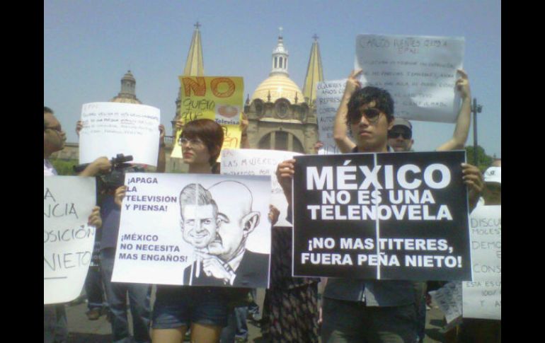 Jalisco | Un contingente de alrededor de dos mil personas se manifiestan contra el priista Tapatíos marchan contra Peña Nieto Un contingente de alrededor de dos mil personas marchan en contra de la candidatura de Enrique Peña Nieto Por: EL INFORMADOR 19 de mayo de 2012 - 12:20 hs Aunque no hay cifras oficiales, personal de Vialidad dice que se ha sumado más gente conforme avanza la manifestación. / GUADALAJARA, JALISCO (19/MAY/2012).- "Somos el pueblo, no somos acarreados". "Viva la prole, viva la prole" y "pueblo, informado, jamás manipulado". Con estas consignas un contingente de alrededor de dos mil personas marchan en contra de la candidatura de Enrique Peña Nieto a la presidencia de la república. Aunque no hay cifras oficiales, personal de Vialidad dice que se ha sumado más gente conforme avanzan la manifestación. El contingente salió a las 12:30 de la Plaza Liberación. Tomaron la calle 16 de septiembre y ahora marchan por avenida Juárez, tomando únicamente dos carriles de los cuatro. El plan es llegar al Parque Revolución. La marcha no tiene afiliación partidista, y se pide la democratización de los medios electrónicos, principalmente de Televisa y TV Azteca, pues los manifestantes señalan cobertura sesgada en el actual proceso electoral. Luego de que el contingente llegó al parque Revolución, los integrantes de la marcha eligieron mediante votos que irían a las instalaciones de Televisa, ubicadas en la colonia Moderna. Pese al calor el grupo que lejos de disminuir ha aumentado, ha tomado la avenida Vallarta para después girar hacia la izquierda por Enrique Díaz de León, llegar a Televisa para finalmente tomar el destino final de la marcha. EL INFORMADOR / OMAR GARCÍA Temas Manifestaciones en Jalisco Enrique Peña Nieto Municipios PRI Jalisco Lee También Morena Jalisco respalda Reforma Judicial Comienza en Jalisco la Campaña Nacional de Vacunación de invierno Charros de Jalisco buscará frenar su racha negativa en juegos inaugurales de la LMP Autos con estas placas deben realizar la Verificación Vehicular antes del 31 de octubre Recibe las últimas noticias en tu e-mail Todo lo que necesitas saber para comenzar tu día Registrarse implica aceptar los Términos y Condiciones