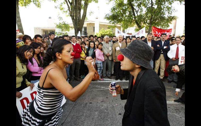 Jalisco | Se protagonizó una parodia de amor representada por tres payasos Teatro y danza en Casa Jalisco Se protagonizó una parodia de amor representada por tres payasos Por: EL INFORMADOR 9 de octubre de 2010 - 05:29 hs Más de 350 bachilleres presenciaron una parodia de amor representada por tres payasos, así como escenas de ballet. EL INFORMADOR / GUADALAJARA, JALISCO (09/OCT/2010).- Siete estudiantes del grupo de danza contemporánea de la Preparatoria 12 interpretaron ayer dos de sus números frente a Casa Jalisco, con la intención de exigir al gobernador que entregue los recursos pendientes a la Universidad. También se protagonizó una parodia de amor representada por tres payasos. El director del bachillerato, Manuel Velasco Gudina, explicó que ambas representaciones fueron una forma de hacer lúdica la protesta número 18 que se realiza frente al recinto localizado en Avenida Manuel Acuña. Las interpretaciones fueron observadas por los dirigentes universitarios que encabezaban la movilización de 350 bachilleres. Frente a los alumnos, el director recordó que las demandas presupuestarias de la Universidad corresponden tanto a los 701 millones de pesos (MDP) de contrapartidas federales pendientes, como a los 390 millones que completan los 520 millones de pesos correspondientes a la ampliación presupuestal solicitada a principios de año. Velasco Gudina presumió el primer lugar obtenido por un alumno en el Concurso Nacional de Apartados y Experimentos en la categoría de “Física”. Al pie del recinto, los alumnos dejaron un cartel donde se hacía mención de dicho logro, pero en esta ocasión no fueron recibidos por personal de Asuntos del Interior del Ejecutivo. Para saber La UdeG suma 18 movilizaciones en Casa Jalisco, una en Palacio de Gobierno y la megamarcha. Temas Manifestaciones en Jalisco Educación local UdeG Presupuesto UdeG Recibe las últimas noticias en tu e-mail Todo lo que necesitas saber para comenzar tu día Registrarse implica aceptar los Términos y Condiciones