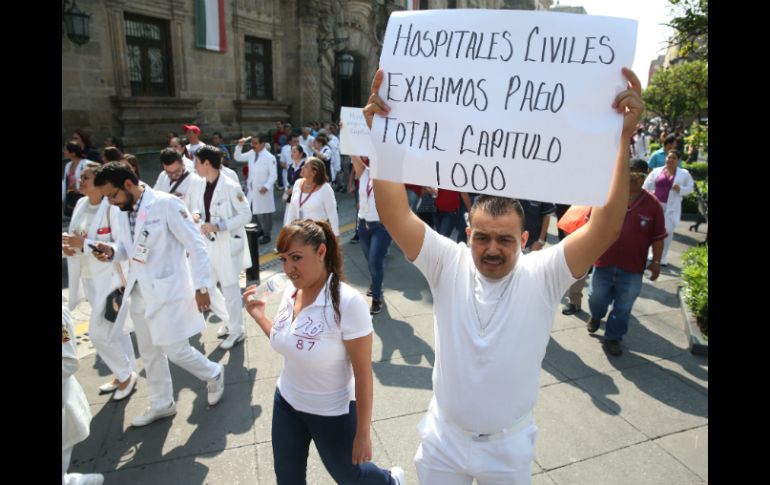 GUADALAJARA, JALISCO (05/DIC/2016).- Ante la falta de respuesta por parte de la autoridades estatales en el tema de incrementar el presupuesto a la institución, así como el atraso de pagos del Seguro Popular, el Sindicato Único de Trabajadores del Hospital Civil de Guadalajara realizará una nueva marcha el próximo jueves, 8 de diciembre. Se espera que los trabajadores, residentes, médicos y demás personal salgan del Antiguo y Nuevo Civil, para dirigirse hacia el Congreso del Estado, donde pedirán una audiencia inmediata con la comisión de Hacienda, anunció el secretario del Sindicato, Juan José Hernández Rodríguez. "Saldremos nuevamente a las calles de Guadalajara, haciendo un enérgico pronunciamiento y un rechazo total a esta situación que es inadmisible; vamos a defender el presupuesto del Hospital Civil de Guadalajara y vamos a defender con uñas y dientes el sueldo de los trabajadores, que somos más de siete mil". En rueda de prensa, se anunció que por falta de dinero para la compra de insumos hospitalarios, tan sólo hoy, lunes, se tuvieron que posponer alrededor de 100 cirugías selectivas, las cuales fueron reprogramadas para otro día. Además, se reiteró que sigue sin haber uniformes para los residentes, así como tampoco se ha pagado el aguinaldo, que normalmente se deposita a mediados de noviembre. Otra de las denuncias fue que el gobierno del Estado ha incumplido en la entrega de 100 millones de pesos mensuales, tal como se acordó con las autoridades del hospital. "Había un acuerdo de que íbamos a recibir 100 millones de pesos mensuales, de noviembre a febrero, para cumplir con los 400 millones restantes; al día de hoy no han llegado los 100 millones de noviembre, estamos a cinco de diciembre y, hay una incertidumbre porque, si nos están dando este trato, qué nos garantiza que sí nos van a depositar los acuerdos". EL INFORMADOR / THAMARA VILLASEÑOR