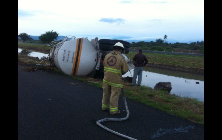 Jalisco | Bomberos trabajaron para contener la fuga de una de las válvulas de descarga Tráiler con diesel vuelca en autopista Guadalajara-Colima Bomberos trabajaron para contener la fuga de una de las válvulas de descarga Por: EL INFORMADOR 23 de octubre de 2013 - 17:41 hs El incidente se reportó en la autopista Colima-Guadalajara a la altura del kilómetro 32. ESPECIAL / GUADALAJARA, JALISCO (23/OCT/2013).- Un tráiler cisterna de doble remolque, cargado con 62 mil litros de diesel, volcó una de sus pipas la madrugada de este miércoles, provocando la movilización de personal de la Unidad Estatal de Protección Civil y Bomberos de Jalisco ( UEPCBJ), con destacamento en Ciudad Guzmán. El incidente se reportó en la autopista Colima-Guadalajara a la altura del kilómetro 32, entre Zacoalco de Torres y Teocuitatlán, donde el personal de esta dependencia, se coordinó en las labores de recuperación del pesado con autoridades municipales y federales, así como de la propia autopista. Se trabajaron varias horas para contener la fuga en una de las válvulas de descarga y otra en la escotilla, así como para lograr incorporar el vehículo pesado y hacer el transvase de los 31 mil litros del hidrocarburo a otra cisterna. El remolque cisterna, con matrícula de circulación 736WN6 de carga, era conducido por Ignacio Ríos Martínez, de 45 años de edad, con domicilio en Soyaniquilpan de Juárez, en el Estado de México. Bomberos aseguran que este tipo de accidentes son frecuentes en estas carreteras, por lo que recomiendan a los conductores extremar medidas de seguridad en el manejo de sus autotransportes, así mismo piden a los conductores particulares mantener distancia prudente de sus autos respecto a las unidades pesadas. Temas Seguridad Accidentes Protección Civil Jalisco Lee También Harfuch y los medios Gobierno federal refuerza combate a extorsión y desapariciones Cartucho Astros de Jalisco toma ventaja sobre Xalapa en la semifinal de zona Recibe las últimas noticias en tu e-mail Todo lo que necesitas saber para comenzar tu día Registrarse implica aceptar los Términos y Condiciones