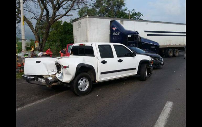 GUADALAJARA, JALISCO (02/AGO/2016).- Este martes a las 08:50 hrs. en el Km 030+100 de la carretera Santa Rosa-La Barca en el tramo Atequiza-Ocotlán ocurrió un accidente entre cinco vehículos, entre los cuales se encuentra la patrulla de la Policía Federal 16667, así como un vehículo tracto camión articulado y tres vehículos particulares con saldo de una persona lesionada.Los hechos ocurrieron cuando el tracto camión circulaba en dirección a Ocotlán a exceso de velocidad y al llegar a los reductores de velocidad frenó bruscamente, perdiendo el control del pesado camión e impactó a la patrulla que estaba estacionada fuera de los rúa.También alcanzó a tres vehículos que circulaban en la zona a baja velocidad por los llamados topes, el camión terminó en el carril derecho, mientras los vehículos impactados sobre el acotamiento de la carretera.