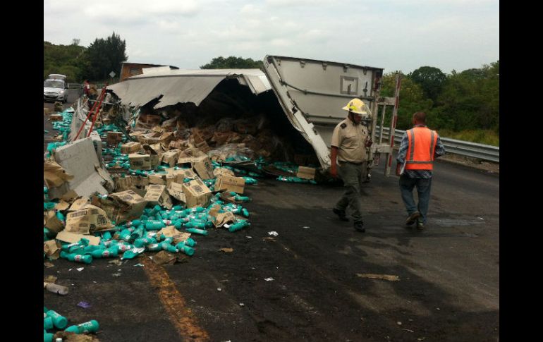 Jalisco | Bomberos del Estado apoyan en el accidente que sólo causó derrame de sustancias Tráiler vuelca en autopista Guadalajara-Ciudad Guzmán Bomberos del Estado apoyan en el accidente que sólo causó derrame de sustancias Por: EL INFORMADOR 8 de octubre de 2013 - 17:23 hs En la zona de los carriles se realizaron trabajos para evitar un derrame mayor. ESPECIAL / GUADALAJARA, JALISCO (08/OCT/2013).- Bomberos del Estado apoyaron este mediodía en un accidente registrado en el municipio de Acatlán de Juárez, en el kilómetro 3 de la Autopista Guadalajara-Ciudad Guzmán, donde un tráiler se volcó ocasionando derrame de sustancias. El tráiler Freightliner modelo 2006, con placas de circulación 281EJ4, transportaba 30 toneladas de botellas de cloro, de las cuales algunas se derramaron sobre la carpeta asfáltica. En la zona de los carriles con circulación Guadalajara-Colima, la Unidad Estatal de Protección Civil y Bomberos Jalisco realizó trabajos para evitar un derrame mayor, quedando la limpieza de la carpeta en manos de empleados de la autopista y de bomberos municipales, resguardados por elementos de la Policía Federal. El conductor del tractocamión, perteneciente a la empresa Merza Logística S.A. de C.V. del Estado de Michoacán, se dio a la fuga. Temas Seguridad Accidentes Carreteras de Jalisco Lee También Charros de Jalisco remonta y vence a Guasave con una gran noche de Bligh Madris Realizan toma de protesta del Consejo Directivo de la ANDDAPA Charros de Jalisco inaugura la temporada de invierno de beisbol Brenda Carrera rinde primer informe legislativo Recibe las últimas noticias en tu e-mail Todo lo que necesitas saber para comenzar tu día Registrarse implica aceptar los Términos y Condiciones