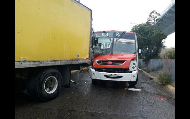 GUADALAJARA, JALISCO (29/AGO/2017).- Un camión de la ruta 161 y un camión de carga chocaron por alcance sobre Av. Laureles en el cruce de Boulevard Charros y Boulevard de Rodeo en la colonia Olímpica, en Zapopan.Tras el impacto, el camión de carga se estrelló con un poste de la Comisión Federal de Electricidad (CFE) y en el automóvil de un particular que llegaba a su domicilio.Elementos de Protección Civil y Bomberos de Zapopan, informaron que tras el percance resultaron 12 personas lesionadas, entre ellos el chofer del camión de carga pesada.Paramédicos de la corporación de Zapopan y de Cruz Verde, asistieron a dos personas en estado regular y seis más en estado leve; cuatro de los heridos decidieron firmar el desistimiento para la atención médica.