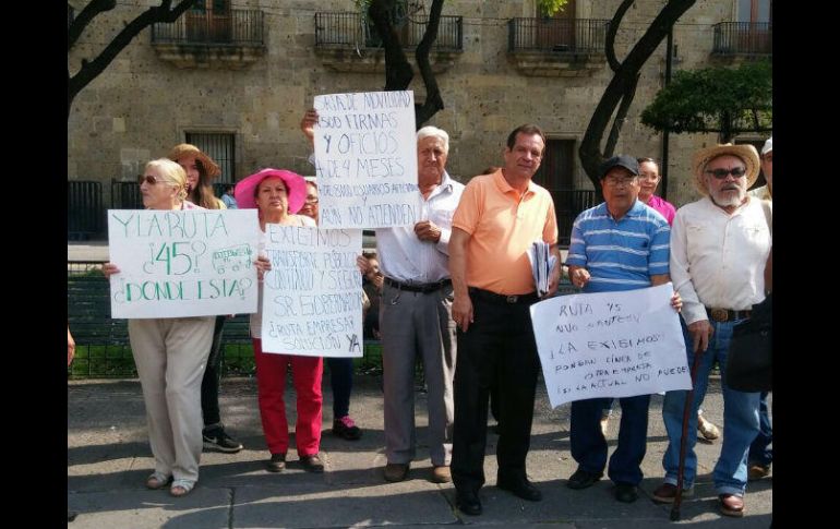 GUADALAJARA, JALISCO (12/JUN/2017).- Un grupo de cerca de 20 personas se reunió esta mañana a las afueras del Congreso del Estado para manifestar sus inconformidades ante la desaparición de la Ruta 45 del transporte público.Los manifestantes, representantes de las colonias San Vicente, San Marcos, Vicente Guerrero, Santa Rosa y Circunvalación-Belisario, aseguraron tener más de un mes sin el servicio de esta ruta, por lo que ahora deben caminar de ocho a 10 cuadras aproximadamente para poder tomar otra ruta de transporte."Primero pasaba cada 15 minutos, luego cada media hora, tres cuartos de hora, después cada dos horas y luego de la nada dejó de pasar" refirió una de las manifestantes.Afirmaron que tienen cerca de cuatro meses que acudieron a la Secretaría de Movilidad (Semov) para pedir que les solucionaran el problema, y que incluso esta es la tercera ocasión que se presentan ante el Congreso a presentar sus peticiones, sin embargo nadie les ha dado respuesta alguna.Por esta razón, esperan que los diputados encargados de la Comisión de Movilidad hagan un llamado a la Semov para que sus quejas y peticiones sean atendidas y de esta forma se le de solución al problema: Que se reanude el servicio de transporte de forma continua y segura.Además, piden que se realice un diagnóstico de origen y destino que considere a los más de ocho mil usuarios que utilizan el servicio diariamente, como criterio para la implementación de una nueva ruta de transporte. EL INFORMADOR / RUBÍ BOBADILLA