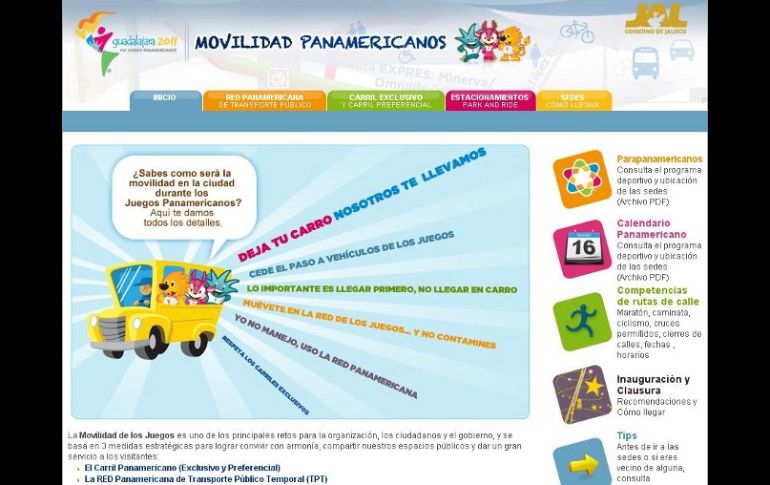 Jalisco | Pretende dar un gran servicio a los jóvenes atletas y visitantes de la justa deportiva Vialidad presenta el portal de 'Movilidad Panamericanos' El sitio web permitirá conocer información gráfica sobre la red de carriles panamericanos exclusivos y preferentes Por: NTX 13 de septiembre de 2011 - 10:09 hs En la imagen, página inicial del portal de movilidad durante los Juegos Panamericanos. ESPECIAL / GUADALAJARA, JALISCO (13/SEP/2011).- El secretario de Vialidad y Transporte, Diego Monraz Villaseñor, informó que está disponible para ser consultado a través de Internet el portal de 'Movilidad Panamericanos'. Explicó que este proyecto se basa en tres medidas estratégicas para lograr convivir con armonía, compartir nuestros espacios públicos y dar un gran servicio a los jóvenes atletas y visitantes de los Juegos Panamericanos Guadalajara 2011, a celebrarse del 14 al 31 de octubre. La página http://movilidadpanamericanos.jalisco.gob.mx, permite conocer información gráfica sobre la red de carriles panamericanos exclusivos y preferentes; las rutas especiales de transporte público panamericano, así como el sistema de estacionamientos satelitales, conocidos también como '’Park and Ride'. Este sitio fue creado especialmente por el Gobierno del estado y la Secretaría de Vialidad y Transporte para apoyar al Comité Organizador de los Juegos Panamericanos Guadalajara 2011 con todo lo relevante a la movilidad panamericana en la ZMG y las Subsedes. Facebook y Twitter son compatibles con las herramientas informativas de la página, tales como: Red Panamericana de Transporte Público Temporal (detalle de rutas, cómo usarla, imagen) gratuita para Voluntarios y Fuerza de Trabajo. Carriles Panamericanos (exclusivos y preferenciales y detalles de funcionamiento), estacionamientos Remotos o Park & Ride (ubicaciones y formas de llegar), tips para la movilidad en la ZMG y cómo llegar a las sedes y detalle de cómo moverse en las ceremonias de apertura y clausura. Monraz Villaseñor advirtió que por cuestiones operativas de movilidad, a partir del 20 de septiembre la Zona Metropolitana de Guadalajara debe de tener todas sus vialidades libres de obra pública, por lo que invitó a los Gobiernos municipales y Secretaría de Desarrollo Urbano a terminar sus trabajos antes de esa fecha. El funcionario aclaró que las intervenciones menores y de imagen urbana de las diferentes obras que se realizan en la ciudad podrán continuar después de este día mientras no impliquen cierres viales. Temas Vialidad SVyT La ciudad y los Juegos Lee También Clara Brugada rinde su Primer Informe de Gobierno ¿Qué alimentos SÍ pueden comer las ardillas y cuáles NO? Preferencia y circulación Clima en Ciudad de México hoy: el pronóstico para el domingo 12 de octubre de 2025 Recibe las últimas noticias en tu e-mail Todo lo que necesitas saber para comenzar tu día Registrarse implica aceptar los Términos y Condiciones