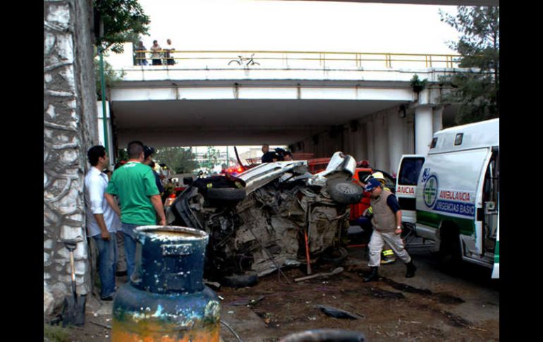 Jalisco | Hay una lesionada de gravedad Vuelca automóvil y cae cobre camión cargado con cilindros de gas El percance se suscitó en el cruce de la Avenida Patria y autopista a Zapotlanejo Por: EL INFORMADOR 18 de junio de 2010 - 04:54 hs Los cilindros de gas quedaron regados en un espacio de 30 metros a la redonda del punto del accidente. ESPECIAL / TLAQUEPAQUE, JALISCO (18/JUNIO/2010).- La pérdida de control de un vehículo, que era conducido por una mujer, provocó una espectacular volcadura, en la cual se vieron involucrados dos automotores; uno de ellos era un camión repartidor de gas. El percance ocurrió a las 08:15 horas de ayer, en el cruce de la Avenida Patria y autopista a Zapotlanejo, en la colonia Real Camichines, del Municipio de Tonalá, donde un vehículo Ford Ghia, con placas JAJ-3095, volcó desde la parte superior de la vía de alta velocidad, cayendo sobre un camión repartidor de gas. El compacto era conducido por Lilia Blanco Santillán, de 35 años, quien quedó prensada al caer encima del camión. Leonardo Bausán Mosqueda, de 39 años, es el chofer del autocamión repartidor, con placas JD71551, de la empresa Gas Tomza, quien, pese a lo aparatoso del percance, salió ileso. Tras el impacto, del camión repartidor salieron disparados los 35 cilindros de gas que transportaba, de los cuales tres de ellos tuvieron fugas parciales, al pegar en contra del suelo. Varios testigos que observaron el accidente de manera inmediata hablaron al 066 para pedir ayuda de los rescatistas debido a que el compacto quedó doblado por la mitad. A la escena del accidente acudieron elementos de la Unidad Estatal de Protección Civil y Bomberos Jalisco ( UEPCBJ), ayudados por bomberos de Tlaquepaque y Tonalá para realizar los trabajos de rescate. Los rescatistas utilizaron el equipo hidráulico mejor conocido como “las quijadas de las vida” para poder rescatar del interior del vehículo a Blanco Santillán. Después de varios minutos la mujer fue liberada y puesta en una camilla de una ambulancia de la Cruz Verde Tlaquepaque, para ser trasladada, debido a que las lesiones que tenía eran consideradas entre regular y graves por lo que fue llevada a la clínica 14 del Instituto Mexicano del Seguro Social ( IMSS) para que recibiera una mejor atención. Además, fue controlada la situación de emergencia de la fuga de gas para evitar una posible explosión en la zona mencionada. Temas Seguridad Accidentes Protección Civil Jalisco Lee También Clausuran centro de rehabilitación en Tonalá por posibles delitos ¿Será obligatorio presentar la CURP biométrica para trámites escolares? Presentan a los cinco finalistas del Premio Adolf B Horn Hombre es condenado por abuso sexual cometido contra su hijastro Recibe las últimas noticias en tu e-mail Todo lo que necesitas saber para comenzar tu día Registrarse implica aceptar los Términos y Condiciones