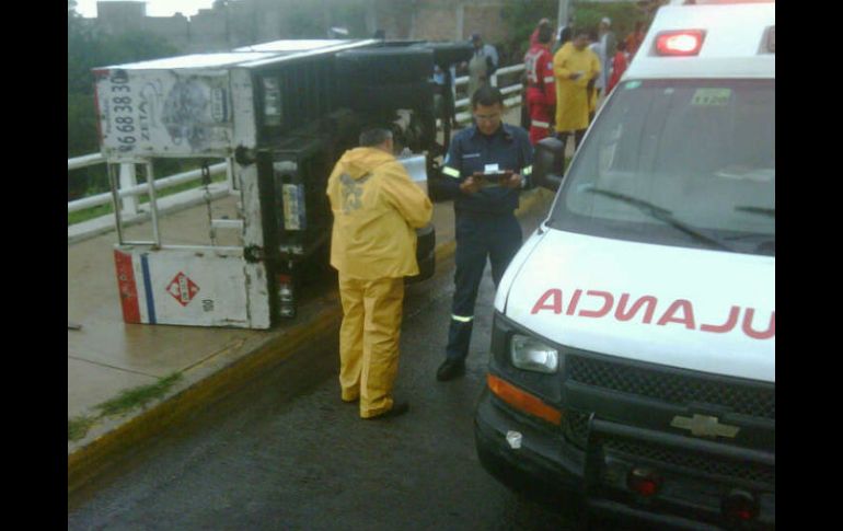 Jalisco | El conductor y único tripulante del automotor resultó ileso Vuelca camioneta repartidora de gas El accidente ocurrió sobre la avenida 8 de Julio casi a su cruce con el Anillo Periférico Sur Por: EL INFORMADOR 31 de julio de 2012 - 12:55 hs La camioneta volcó de costado y los 20 cilindros cargados con gas que llevaba salieron proyectados hacia un barranco. / GUADALAJARA, JALISCO (31/JUL/2012).- Una camioneta repartidora de cilindros de gas tipo L.P., volcó la mañana de este martes en San Pedro Tlaquepaque. A consecuencia de la lluvia matutina de este martes, el conductor de la camioneta repartidora perdió el control del vehículo por la nula visibilidad, ya que no alcanzó a ver un tope pronunciado que se encontraba sobre la avenida 8 de Julio casi a su cruce con el Anillo Periférico Sur. Tras la maniobra, la camioneta volcó de costado y los 20 cilindros cargados con gas que llevaba salieron proyectados hacia un barranco que había en la zona. Walter Emmanuel Cardona Alegría, de 29 años de edad, conductor y único tripulante del automotor resultó ileso en el percance. Temas Accidentes Vialidad SVyT Recibe las últimas noticias en tu e-mail Todo lo que necesitas saber para comenzar tu día Registrarse implica aceptar los Términos y Condiciones