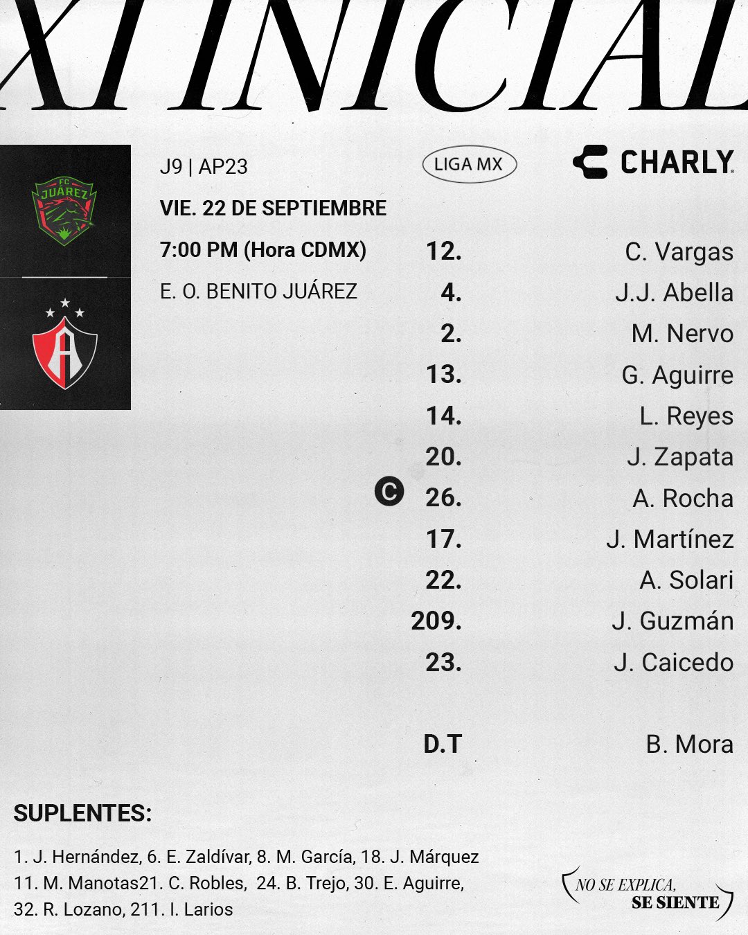 Deportes | Juárez vs Atlas • Momentos destacados • Jornada 9 • Liga MX Los rojinegros visitan al conjunto de Bravos en busca de obtener los tres puntos para posicionarse en los primeros lugares de la tabla general Moisés Figueroa 22 de septiembre de 2023 - 18:40 hs JUÁREZ1 ‒ 2ATLAS Final del Partido Atlas se lleva el triunfo en la frontera tras derrotar a Juárez con marcador de 1-2. Los rojinegros aprovecharon dos errores por parte de la defensa de Bravos para llevarse el triunfo. Los dos tantos fueron por parte de Jordy Caicedo y Jaziel Martínez, por su parte Avilés Hurtado descontó para Juárez por vía de los once pasos. 90' Se agregan 9 minutos 72’ Cerca estuvo el Atlas Mateo García saca un disparo tras una buena pared, pero la reacción de Talavera es mucho mejor y salva a su equipo. 68' ¡Goooooooooooooooooool de Juárez! Avilés Hurtado marca el penal con gran categoría y mete a Juárez en el juego. ¡¡¡G⚽⚽⚽L!!! Avilés Hurtado convirtió desde el manchón penal.#LigaBBVAMX | #Apertura2023 | #NoTeLoPierdas pic.twitter.com/IeMnzKPgyZ — Liga BBVA MX (@LigaBBVAMX) September 23, 2023 65' ¡Penal para Bravos! Reyes comete falta contra Diego Valoyes tras intentar despejar el balón y el árbitro no duda en marcar el penal. 51' ¡Gooooooooooooooooooooooooool del Atlas! Nuevamente la defensa de Juárez y Talavera se equivocan tras dejar picar el balón, y Jaziel aprovecha para ampliar el marcador. Comienza el segundo tiempo El árbitro central hace sonar su silbato para reanudar las acciones en el Estadio Olímpico Benito Juárez. Se termina el primer tiempo Atlas se va al descanso con ventaja tras el único tanto de Caicedo apenas al minuto 3 45' Se agregan 8 minutos al primer tiempo 37' Se salva otra vez el Atlas Avilés Hurtado dispara a portería dentro del área tras una buena asistencia, pero Nervo le quita el gol tras una buena barrida; ya es más Juárez. 33' Avisan los Bravos Avilés intenta sorprender a Camilo con una vaselina, pero el balón pasa desviado del arco rojinegro. ¡Se salva el Atlas! Juárez busca el empate pero no logra definir #MásAcciónMásDiversión #DBUTAzteca #JuárezvsAtlas @calientesports te presenta los mejores momentos mientras apuestas y ganas en #LigaMX https://t.co/UvZD9hks6G EN VIVO: https://t.co/zHmty2s0QI pic.twitter.com/WI2V2S4n40 — TV Azteca Deportes (@AztecaDeportes) September 23, 2023 29' El árbitro le quita la roja al rojinegro El árbitro revisa la jugada en el VAR y le quita la tarjeta roja a Zapata; queda amonestado el jugador rojinegro. ¿Era roja? Juan Zapata se va amonestado tras la fuerte entrada #MásAcciónMásDiversión #DBUTAzteca #JuárezvsAtlas @calientesports te presenta los mejores momentos mientras apuestas y ganas en #LigaMX https://t.co/UvZD9hks6G EN VIVO: https://t.co/zHmty2s0QI pic.twitter.com/rvlMbJQ09M — TV Azteca Deportes (@AztecaDeportes) September 23, 2023 26' Roja para el Atlas Zapata se va expulsado luego de cometer una falta contra Avilés Hurtado. 15' Partido intenso de ambas escuadras Bravos intenta reaccionar luego del gol tempranero en contra, mientras que Atlas no renuncia al ataque y busca el segundo tanto. 3' ¡Goooooooooooooooooooool del Atlas! Caicedo marca el primero para el rojinegro luego de una equivocación de Talavera y el defensor. ¡¡¡G⚽⚽⚽L!!! Muy temprano en el partido, Jordy Caicedo anotó para los Rojinegros en la frontera.#LigaBBVAMX | #Apertura2023 | #NoTeLoPierdas pic.twitter.com/7g348Oj9xU — Liga BBVA MX (@LigaBBVAMX) September 23, 2023 Inicia el partido El árbitro central hace sonar su silbato y comienza a rodar el balón en la cancha del Estadio Olímpico Benito Juárez. Alineación del Atlas Así sale al terreno de juego el conjunto dirigido por Benjamín Mora: Temas Bravos de Juárez Atlas Liga MX Futbol Mexicano Lee También México listo para un nuevo desafío en el Mundial Sub-17 Femenil Todas las selecciones que han calificado al Mundial 2026 hasta hoy Chivas y América calientan en redes el Clásico Nacional de la Fecha FIFA Barcelona interesado en Gilberto Mora, esto es lo que se sabe