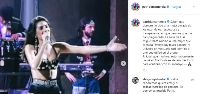 Luego de que en el tercer capítulo de "Luis Miguel, la serie" se mostrará al personaje de Paola Montero, muchos espectadores comenzaron a notar las similitudes entre este y la actriz y cantante Paty Manterola, algo que la exGaribaldi también notó.Manterola ha utilizado sus redes sociales para deslindarse de todo lo que se dice en el capítulo sobre el personaje que reconoce también cree que tiene similitud con ella en esa época de los 90."Siempre he sido una mujer alejada de los escándalos, respetuosa y transparente, así que para los que me han preguntado; la serie de Luis Miguel hace alusión a una mujer que cantaba ‘Everybody loves banana’ y utilizaba un vestuario casi idéntico a uno que utilicé en el grupo. Al igual que muchos, automáticamente pensé en Garibaldi", detalló.Pese a esta similitud, Manterola niega que lo que se retrata de ese personaje, nada tiene que ver con lo que ella vivió en esa época."Si ellos (la producción) están haciendo cualquier alusión a mi persona, difiere completamente con la calidad de mujer que siempre he sido y con la historia privada que viví en esos años con las personas que estuvieron presentes en mi vida", detalló.Por ello negó que ella haya tenido algún tipo de relación con Luis Miguel o lo hubiese acompañado a los lugares que presenta el capítulo de la serie de Netflix."Muy por el contrario de como lo plantea la serie y por si existiera la duda, quiero dejar muy claro que yo jamás estuve con él (Luis Miguel) en un estudio de grabación, ni me vi con él en Viña del Mar, ni me fui de fiesta con él al Bar Bar, no fumo, no tuve ninguna historia con Cristian Castro y nunca hablé con él de no asistir al cumpleaños de su hija, lo cual me parece, sumamente fuerte, insensible y desafortunado", consideró.Finalmente la actriz dijo que no sabe si en algún punto contará su versión de lo sucedido y reafirma que no permitirá que se ponga en tela de juicio su integridad."Por la mujer íntegra que soy, no sé si algún día compartiré mi versión de todo lo relacionado con este tema y si valga la pena, ya que los que me conocer saben perfectamente quién soy en realidad. Pero de lo que sí estoy segura es que siempre levantaré la voz por tantas mujeres que como yo, merecemos respeto", expresó.Manterola detalló que hará valer siempre sus derechos, "existan producciones que ‘cubriéndose’ detrás del término ‘ficción’, sean capaces de alterar los hechos de esa manera para obtener un beneficio de la historia personal, imagen e integridad de terceros, los cuales deliberadamente señalan con otros nombres, pero de manera tan directa, agregando datos claros que hacen referencia tajantemente a personas de la vida real y sin su consentimiento".jb