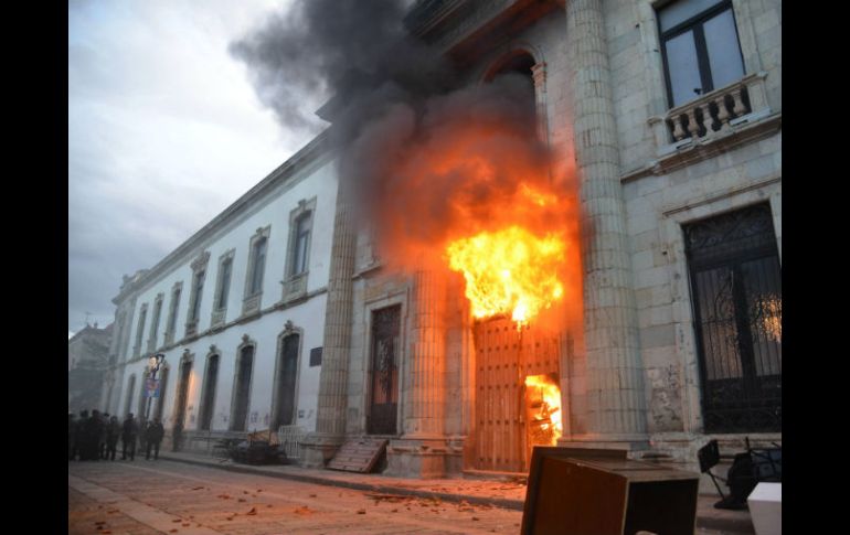 OAXACA, OAXACA (18/NOV/2016).- En los disturbios de la tarde-noche del jueves y la quema de la puerta lateral de un edificio de la Facultad de Derecho de la Universidad Autónoma “Benito Juárez” de Oaxaca (UABJO) participaron catedráticos y funcionarios universitarios, acusó el abogado general de la institución, Héctor López Sánchez.En conferencia de prensa, informó que se presentó una denuncia penal ante la Fiscalía General del Estado y otra en la delegación estatal de la Procuraduría General de la República, esta última al ser formar el edificio parte de la declaratoria de Patrimonio Cultural de la Humanidad por la UNESCO.Sin embargo, se negó a proporcionar nombres de presuntos “porros” y seguidores del director electo de la Facultad, Miguel Ángel Vásquez Ramírez, quienes presuntamente habrían quemado la puerta, así como varios muebles, desde el interior del recinto, ubicado en el centro de la ciudad de Oaxaca.Entre quienes participaron en los hechos vandálicos, señaló a Amílcar Sosa Velasco, actual secretario de Administración de la UABJO; dirigentes de fracciones sindicales como Amado Wilchis y Luis Alberto Hernández Ortiz, entre otros; catedráticos como Mauro Francisco Pérez Carrasco, Jesús Villavicencio, Manuel Jiménez Arango y Miguel Ángel Ramírez Hernández, candidato perdedor de las elecciones del viernes pasado.Indicó que con anterioridad se han presentado denuncias contra los mismos personajes, como la del 4 de julio 2016, en la carpeta de investigación 135/2016, por despojo de instalaciones universitarias; el 6 de julio, el legajo de investigación 1135/2016, por robo en instalaciones universitarias imputadas, y el 15 de noviembre bajo la carpeta 1396/2016, por despojo.Por otra parte, el abogado general de la UABJO lamentó que pese a que desde el 14 de noviembre se solicitó presencia policiaca a la Secretaría de Seguridad Pública para prevenir hechos vandálicos, éste no se brindó; en tanto que el jueves, tardó en prestar el auxilio.La Fiscalía General del Estado reportó por su parte que suman 11 personas detenidas, entre ellas dos menores de edad, por participar en los hechos delictivos del jueves, y cinco personas resultaron con lesiones menores.