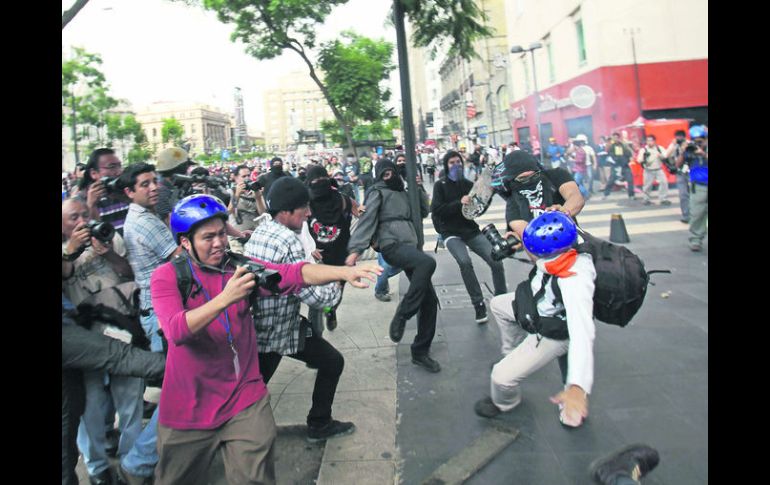 México | Manifestantes intentaban impedir que los reporteros registraran los desmanes Agreden a periodistas en protesta por 'Halconazo' Encapuchados intentaban impedir que los reporteros registraran los desmanes durante la manifestación Por: EL INFORMADOR 11 de junio de 2014 - 03:14 hs Violencia. Anarquistas golpearon a fotorreporteros que captaban los desmanes que iban realizando. SUN / CIUDAD DE MÉXICO (11/JUN/2014).- La protesta para conmemorar el llamado “Halconazo” terminó de manera violenta en contra de la prensa. Encapuchados autodenominados anarquistas intentaron impedir que reporteros registraran los desmanes que realizaban y golpearon a algunos, además de quebrarle el equipo a un fotógrafo. Unas 200 personas protestaron en repudio a la represión orquestada por los llamados “Halcones”, un grupo paramilitar que reprimió una manifestación de estudiantes en el sexenio de Luis Echeverría (1970-1976) Los anarquistas lanzaron una bomba molotov en contra de la sede del Partido Revolucionario Institucional (PRI) capitalino, ante la ausencia de la Policía. Cuando la marcha pasaba por la Avenida Juárez, a la altura de la Alameda Central, los encapuchados iniciaron pintas en edificios. Los fotógrafos se acercaron a registrar los hechos y los manifestantes comenzaron a agredirlos. Ya en el Zócalo, incendiaron una piñata de la Copa Mundial de la FIFA y la patearon hacia donde estaba la prensa. Pese a los incidentes, no se registraron heridos. Temas Estados Ciudad de México Manifestaciones en la Cd. de México Agresiones a periodistas Recibe las últimas noticias en tu e-mail Todo lo que necesitas saber para comenzar tu día Registrarse implica aceptar los Términos y Condiciones
