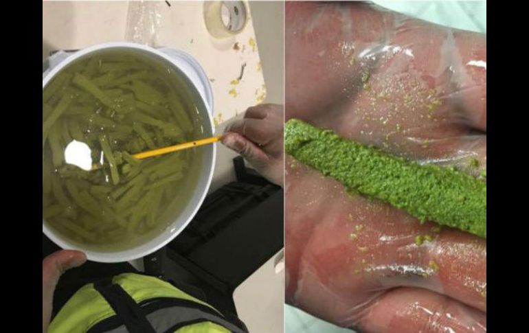 CIUDAD DE MÉXICO (11/JUN/2017).- Elementos de la Policía Federal (PF) aseguraron en el Aeropuerto Internacional de la Ciudad de México (AICM) tres cubetas con metanfetamina disfrazada de nopales en trozos que serían enviadas a Holanda.Las cubetas eran trasladadas dentro de una caja de cartón y fueron detectadas mediante revisiones con un aparato de rayos X que registraba imágenes de tono obscuro que no eran acordes con el material orgánico señalado en la guía de envío.Los policías federales abrieron la caja de cartón y en las cubetas hallaron líquido aceitoso que simulaba ser baba de nopal pero con un olor intenso a compuesto químico y "al momento en que los trozos del supuesto nopal eran tocados, éstos se desintegraban hasta convertirse en material pastoso que se mimetizaba con el líquido", indicó la Policía Federal.Las cajas fueron enviadas por una mujer con domicilio en Guadalajara, Jalisco y en la documentación se indicó que tenía como destino la ciudad holandesa de Róterdam.Los federales dieron parte el Ministerio Público federal quién continuará con las investigaciones correspondientes.