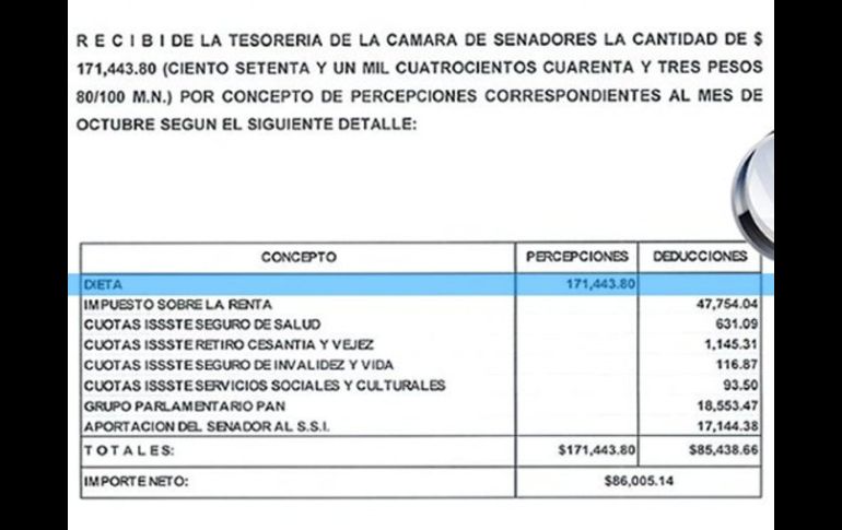 México | Daniel Ávila reconoce que en el Senado falta mucho por hacer en transparencia Cada senador percibe una dieta mensual de más de 170 mil pesos El senador del PAN da a conocer su página en Internet en la que desglosa los recursos públicos que recibe Por: SUN 14 de noviembre de 2012 - 16:20 hs Ávila Ruiz realiza este ejercicio por segunda ocasión. ESPECIAL / CIUDAD DE MÉXICO (14/NOV/2012).- El senador del Partido Acción Nacional (PAN), Daniel Ávila Ruiz, reveló que cada legislador en la cámara alta percibe una dieta mensual de más de 170 mil pesos. Aseguró que se requiere empujar acciones de transparencia en el Poder Legislativo, y como muestra dio a conocer su página en Internet en la que desglosa los recursos públicos que recibe. En los documentos que subió a la página, refiere que su dieta es de 171 mil 443 mil pesos, de los cuales 18 mil 553 provienen del grupo parlamentario del PAN. El senador panista reconoció que en el Senado falta mucho por hacer en transparencia, ya que hay información que debería ser pública y no se difunde, además de que la página no satisface las necesidades de la sociedad. "En el caso del senado, el acceso a la información obligatoria de transparencia incluyendo las actividades de las comisiones y los propios legisladores y sus remuneraciones requieren muchas horas de trabajo y consulta, así como datos que no siempre son del dominio público. En su estado actual la página del Senado no satisface las necesidades de información de los ciudadanos. En ello, tenemos y debemos de trabajar", comentó. Informó que 17 mil 144 pesos son del Seguro de Separación Individualizada, entregado al final del servicio y el cual se complementa con una cantidad similar por parte del gobierno. Expuso que se le retienen de Impuesto Sobre la Renta 47 mil 754 pesos y de aportación al ISSSTE, mil 985. De esta manera, al restar el pago de estos impuestos, cada senador recibe 123 mil 120 pesos. Un senador que no pertenece a ningún grupo parlamentario como es el caso de Mónica Arriola, de Nueva Alianza, y de Layda Sansores, de Movimiento Ciudadano, podrían tener un salario mensual de 102 mil 582 pesos. Según la información de Dávila, recibe adicionalmente al mes cinco mil pesos por el concepto de Apoyo de Gestión, 15 mil pesos por Actividad Legislativa y 40 mil pesos para Atención Ciudadana. Asimismo, reporta la asignación de 75 mil pesos mensuales por concepto de Asesoría legislativa. Ávila Ruiz realiza este ejercicio por segunda ocasión, como diputado federal también mantuvo público un sitio web en el que podían observarse sus documentos relacionados con los recursos públicos que recibe. Temas Política Senado Transparencia y Acceso a la Información Lee También Pakistán y Afganistán acuerdan un cese al fuego Argumento para una rebelión Venezuela Una vacuna contra el egoísmo Recibe las últimas noticias en tu e-mail Todo lo que necesitas saber para comenzar tu día Registrarse implica aceptar los Términos y Condiciones