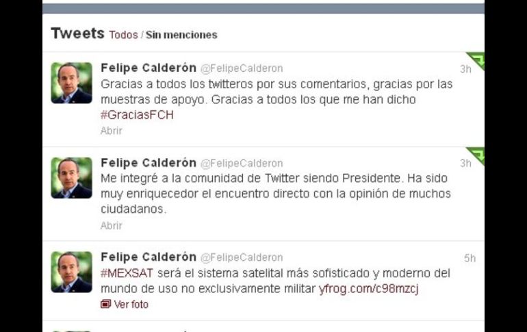 México | Muestra su gratitud a la comunidad en redes sociales Calderón agradece a tuiteros Desde su cuenta oficial, el Mandatario agradece los comentarios y las muestras de apoyo que le hicieron llegar durante el sexenio Por: EL INFORMADOR 29 de noviembre de 2012 - 20:14 hs El Mandatario se dice agradecido por las muestras de apoyo. ESPECIAL / GUADALAJARA, JALISCO (29/NOV/2012).- El Presidente de México ha demostrado su gratitud a la comunidad en redes sociales, desde su cuenta oficial en Twiter, Felipe Calderón agradeció los comentarios y las muestras de apoyo que en 140 caracteres le hicieron llegar durante el sexenio. “Me integré a la comunidad de Twitter siendo Presidente. Ha sido muy enriquecedor el encuentro directo con la opinión de muchos ciudadanos” fue el primer tuit que el mandatario compartió con sus más de dos millones de seguidores. Y continuó: “Gracias a todos los twitteros por sus comentarios, gracias por las muestras de apoyo. Gracias a todos los que me han dicho #GraciasFCH”. El mensaje ha sido retuiteado más de mil veces y bajo esa etiqueta ya circular respuestas y críticas a su gobierno. POR ALEJANDRO OROZCO Temas Gobierno de México Felipe Calderón Twitter Lee También 5 elementos que no deben faltar en la ofrenda de Día de Muertos para las mascotas Top 5 de lugares escalofriantes de México que debes visitar Jugo "levanta muertos", la receta ideal después de una noche de exceso Van 13 asesinatos en 18 meses, tras denunciar extorsiones del crimen organizado Recibe las últimas noticias en tu e-mail Todo lo que necesitas saber para comenzar tu día Registrarse implica aceptar los Términos y Condiciones
