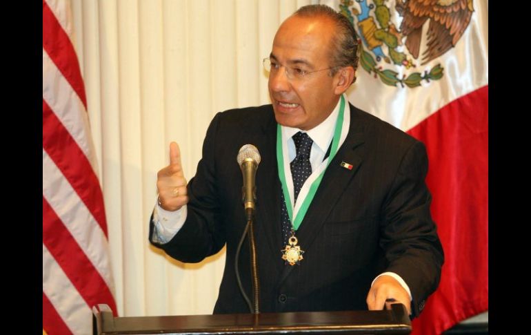 México | Le otorgan la Insignia de Oro por su trabajo en áreas de economía, salud y educación Calderón pide más colaboración de EU en lucha antidroga Le otorgan la Insignia de Oro por su trabajo en el área económica, de la salud y la educación Por: AP 19 de septiembre de 2011 - 19:29 hs NUEVA YORK, EU (19/SEP/2011).- El presidente de México Felipe Calderón, abrió hoy su visita a Nueva York pidiendo más colaboración de Estados Unidos en la lucha contra el narcotráfico y en reducir la demanda interna de drogas. El mandatario destacó que sin más cooperación bilateral la región norteamericana se quedará económicamente detrás de otras y otorgará más victorias a los narcotraficantes. "La demanda de drogas estadounidense es la fuente de poder más importante de los delincuentes a través del flujo de dinero que llega a sus manos", dijo Calderón durante su discurso de aceptación de un premio internacional. "Tenemos que aumentar nuestra cooperación. Tenemos que trabajar juntos para establecer los valores que defendemos". Calderón habló durante una lujosa cena en el hotel Waldorf Astoria de Manhattan, donde la organización Consejo de las Américas le otorgó la Insignia de Oro por su trabajo en el área económica, de la salud y la educación. El presidente se encuentra en la Gran Manzana con motivo del 66 Periodo de Sesiones de la Asamblea General de Naciones Unidas, que empezará el miércoles. Temas Gobierno de México Narcotráfico Felipe Calderón Nueva York Recibe las últimas noticias en tu e-mail Todo lo que necesitas saber para comenzar tu día Registrarse implica aceptar los Términos y Condiciones