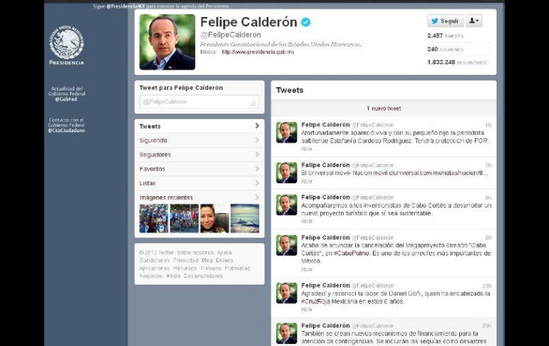 México | El Presidente celebra que Stephanía Rodríguez Cardoso esté bien Calderón promete protección de la PGR a periodista de Coahuila La periodista está viva, junto a su hijo; pero por seguridad no habla de su paradero Por: SUN 15 de junio de 2012 - 17:43 hs En Twitter, Felipe Calderón comunica la aparición de la periodista y su hijo, y asegura que tendrán protección de la PGR. ESPECIAL / CIUDAD DE MÉXICO (15/JUN/2012).- El presidente Felipe Calderón celebró que la periodista del diario ''Zócalo de Saltillo'', Stephanía Rodríguez Cardoso, haya aparecido, luego de que se desconocía su paradero desde el 8 de junio, y prometió protección de la Procuraduría General de la República (PGR). Rodríguez Cardoso se contactó vía telefónica al noticiero ''Atando Cabos'' que conduce Denise Maerker en Radio Fórmula, y aseguró que se encuentra bien junto con su hijo. ''Afortunadamente apareció viva y con su pequeño hijo la periodista saltillense Estefanía Cardoso Rodríguez. Tendrá protección de PGR'', dijo el presidente Calderón Hinojosa, a través de su cuenta de Twitter. Rodríguez dijo a Denise Maerker que en este momento no tiene ningún tipo de protección, pero que se encuentra en un lugar que no puede revelar por su seguridad. La reportera explicó que decidió informar de su situación, ya que hay mucha gente preocupada por ella, pues ni siquiera ha tenido contacto con su familia por la propia seguridad de la misma. ''Estamos bien mi hijo y yo, pero por seguridad no puedo llamar a mi familia, por nuestra integridad no puedo decir dónde estoy, ni cómo llegamos'', expresó a través de la llamada telefónica. Temas Felipe Calderón Estados Coahuila Agresiones a periodistas Recibe las últimas noticias en tu e-mail Todo lo que necesitas saber para comenzar tu día Registrarse implica aceptar los Términos y Condiciones