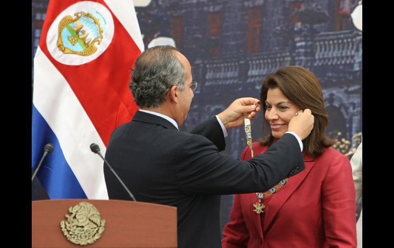 México | Los mandatarios buscan lograr acuerdos para combatir al crimen organizado Calderón y Chinchilla intercambian condecoraciones Calderón impuso a Chinchilla, la condecoración de la Orden Mexicana del Águila Azteca y recibió de la mandataria la condecoración de la Orden Nacional Juan Mora Fernández Por: NTX 22 de agosto de 2011 - 18:22 hs Costa Rica externa voluntad para enfrentar al narcoCIUDAD DE MÉXICO (22/AGO/2011).- El Presidente Felipe Calderón impuso a su homóloga de Costa Rica, Laura Chinchilla, la condecoración de la Orden Mexicana del Águila Azteca, en Grado de Collar, y recibió de la mandataria la condecoración de la Orden Nacional Juan Mora Fernández, en Grado de Gran Cruz Placa de Oro. En un almuerzo que ofrecieron el mandatario mexicano y su esposa, Margarita Zavala, en honor de Chinchilla Miranda en el Castillo de Chapultepec, Calderón Hinojosa señaló que la amistad entre ambas naciones viene de muy lejos, pues son parte de una misma región geográfica y están unidas por tradiciones, sentimientos y valores. Los mexicanos, dijo el mandatario, siempre hemos admirado a los costarricenses por su trabajo en favor de la paz, de la equidad y de la justicia para toda América Latina, y añadió que a ese país se le ha definido como "la Suiza de América". Resaltó que Costa Rica se ha caracterizado antes que muchas naciones por su respeto a la democracia y su defensa decidida de los derechos humanos, así como por ser pionero en las políticas públicas a favor del medio ambiente. Los mexicanos y costarricenses hemos luchado a lo largo de la historia por la libertad y la prosperidad de nuestros pueblos, y hoy enfrentamos nuevos enemigos que buscan coartar la libertad de los ciudadanos, el flagelo del crimen organizado trasnacional, expuso. En su mensaje, Calderón Hinojosa afirmó que la delincuencia organizada pretende imponer sus reglas más allá de nuestras fronteras y por encima de las leyes de los países. Asimismo, sostuvo que la región es víctima de la brutal arremetida del crimen organizado transfronterizo, que compromete a la seguridad de nuestra población y ataca los fundamentos de nuestras democracias. Por ello, añadió que habremos de vencer el desafío de la delincuencia, "porque somos muchos más quienes queremos una Costa Rica y un México de leyes, de instituciones, de seguridad y de justicia". Por su parte, la presidenta de Costa Rica destacó que ambos países están decididos a ahondar esfuerzos para fortalecer sus vínculos económicos, comerciales y de cooperación multilateral. Sostuvo que las relaciones comerciales están "maduras" y los flujos de inversión en ambas direcciones se incrementan, "pero estamos ante un momento propicio para entrar en una nueva etapa de intercambio para beneficio mutuo. Temas Gobierno de México Felipe Calderón Laura Chinchilla Lee También Esto se sabe de la megamarcha de maestros en CDMX el 17 de octubre Vinculan a proceso al joven acusado de homicidio en el CCH Sur Actividades GRATIS en CDMX para celebrar Halloween y Día de Muertos Vecinos de Poza Rica alzan la voz sobre el desastre por lluvias Recibe las últimas noticias en tu e-mail Todo lo que necesitas saber para comenzar tu día Registrarse implica aceptar los Términos y Condiciones