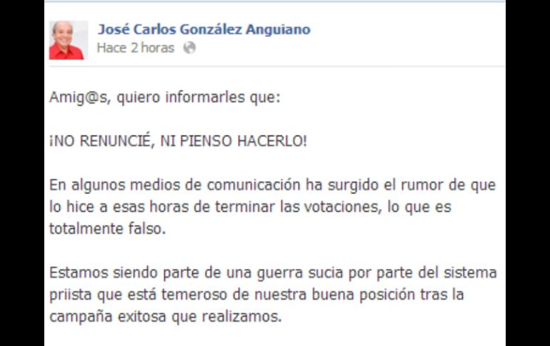 México | José Carlos González asegura que fue un rumor orquestado por el PRI Candidato en Quintana Roo desmiente renuncia José Carlos González asegura que fue un rumor orquestado por el PRI como parte de una guerra sucia Por: SUN 7 de julio de 2013 - 19:45 hs José González dio a conocer que no renunció a través de su página en Facebook. TOMADA DE SITIO OFICIAL / CHETUMAL, QUINTANA ROO (07/JUL/2013).- José Carlos González Anguiano, candidato del Partido del Trabajo a la presidencia municipal de Solidaridad, en Quintana Roo, desmintió haber renunciado este domingo al proceso electoral. Mediante su cuenta de Facebook, el abanderado del PT informó que se trató de un rumor orquestado por el PRI como parte de una guerra sucia en su contra por llevar ventaja en los comicios. "Yo no renuncié ni voy a renunciar; en su momento lo manifesté y hoy lo reitero: de verme favorecido en los comicios, no pienso dar marcha atrás a la revolución propositiva de la verdadera izquierda que hemos iniciado". Afirmó que el Revolucionario Institucional "seguro" le pagó a gente para que difundieran el rumor. Temas Política Partido del Trabajo Quintana Roo Elecciones México 2013 Lee También ¿Dónde ver EN VIVO el partido amistoso México vs Ecuador? ¡Korn regresa a México! Esto debes saber sobre la venta de boletos "La Mañanera" de Sheinbaum de hoy lunes 13 de octubre de 2025 Estiman 100 mil viviendas afectadas por lluvias en 5 estados Recibe las últimas noticias en tu e-mail Todo lo que necesitas saber para comenzar tu día Registrarse implica aceptar los Términos y Condiciones