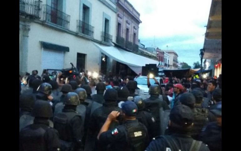 CIUDAD DE MÉXICO (15/SEP/2016).- Después de realizar una marcha de la Fuente de las Ocho Regiones de la ciudad de Oaxaca, maestros de la Coordinadora Nacional de Trabajadores de la Educación (CNTE) arribaron al Centro Histórico de la capital e intentaron ingresar al Zócalo resguardado por policías y vallas.Lo anterior originó un enfrentamiento entre las partes con la detonación de cohetes y gases lacrimógenos, lo que ha derivado en un caos en varias cuadras del centro de la ciudad.Además, se han cerrado negocios y se ha impedido la circulación de vehículos; hay varias personas lesionadas sin especificar hasta el momento el número.Asimismo, han cortado la energía eléctrica en varias calles y los policías fueron reforzados por más elementos en todas las bocacalles del Centro Histórico.La Sección 22 del magisterio tenía previsto realizar su "grito popular" en algún espacio del centro de la ciudad, sin embargo esto no ha sido permitido y son enfrentados por los policías.La gente huye del lugar ante los graves incidentes y se prevé que pueda ser cancelado el Grito oficial que daría el gobernador Gabino Cué en el Palacio de Gobierno.