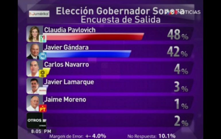 México | Las encuestas de salida colocan a la candidata priista como la favorita a gobernador Claudia Pavlovich lleva la delantera en Sonora Las encuestas de salida colocan a la candidata priista en primer lugar de las preferencias a gobernador Por: EL INFORMADOR 7 de junio de 2015 - 19:25 hs El candidato del MC tiene tres por ciento de las preferencias. ESPECIAL / GUADALAJARA, JALISCO (07/JUN/2015).- Las encuestas preliminares de salida para la gubernatura del estado de Sonora, colocan a la candidata del PRI, Claudia Pavlovich en primer lugar con un 48 por ciento de las preferencias. Por otro lado, el candidato del PAN, Javier Gándara, se posiciona en segundo lugar con un 42 por ciento. Le sigue el aspirante del PRD, Carlos Navarro con un cuatro por ciento. Finalmente, el candidato de Movimiento Ciudadano, Javier Lamarque, tiene el tres por ciento de las preferencias, mientras que Jaime Moreno del PT, obtiene uno por ciento de los votos. Temas Política PRI Sonora Elecciones intermedias México 2015 Lee También La embriaguez del poder: cuando el alma se emborracha de sí misma Ni tan buenos ni tan malos Clima en Ciudad de México hoy: el pronóstico para el domingo 12 de octubre de 2025 Reformas a Ley de Amparo no limita derechos ciudadanos Recibe las últimas noticias en tu e-mail Todo lo que necesitas saber para comenzar tu día Registrarse implica aceptar los Términos y Condiciones