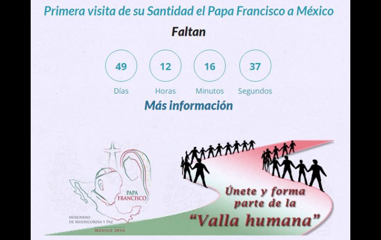 México | La Arquidiócesis de México cuenta días, horas y minutos para la llegada de Francisco Colocan reloj en cuenta regresiva para visita del Papa La Arquidiócesis de México cuenta días, horas y minutos para la llegada de Francisco Por: NTX 24 de diciembre de 2015 - 11:00 hs El reloj electrónico lleva la cuenta regresiva para la primera visita del Papa Francisco al país. ESPECIAL / arquidiocesismexico.org.mx CIUDAD DE MÉXICO (24/DIC/2015).- La Arquidiócesis de México colocó en su página web un reloj electrónico en cuenta regresiva para la primera visita del Papa Francisco al país. En la página www.arquidiocesismexico.org.mx, el reloj incluye la cuenta de los días, horas, minutos y segundos aproximados para que el sumo pontífice llegue en febrero próximo a territorio nacional. De acuerdo con un comunicado del Sistema de Información de la Arquidiócesis de México, las distintas Comisiones del Arzobispado de México trabajan con puntualidad en la preparación de todos los detalles de la visita del jerarca católico. Ello debido a que la estancia del Papa Francisco será histórica y tiene entusiasmados a millones de fieles en todo el país y en el continente. Temas Europa Ciudad del Vaticano Iglesia Católica Arquidiócesis de México Papa Francisco El Papa Francisco en México Papa - Detalles Recibe las últimas noticias en tu e-mail Todo lo que necesitas saber para comenzar tu día Registrarse implica aceptar los Términos y Condiciones