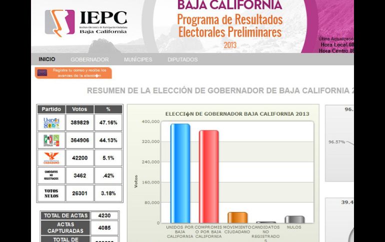 México | No obstante a estos resultados, aceptan errores en el PREP Con 96% del PREP, la coalición PAN-PRD aventaja en BC No obstante a estos resultados, aceptan errores en el Programa de Resultados Electorales Preliminares (PREP) Por: SUN 8 de julio de 2013 - 08:07 hs TIJUANA, BAJA CALIFORNIA (08/JUL/2013).- Con el 96.57% de las actas computadas por el Programa de Resultados Electorales Preliminares (PREP) de Baja California, la coalición Unidos por Baja California, encabezada por el PAN-PRD, aventaja en la elección por la gubernadura de Baja California. Francisco ''Kiko'' Vega de la Madrid lleva la ventaja con el 47.16% de las actas contabilizadas; seguido por Fernando Castro Trenti, de la alianza Compromiso por Baja California, que acumula hasta el momento el 44.13% de los sufragios. Con una lista nominal de dos millones 410 mil 573 votantes, el total de actas computadas hasta el momento son cuatro mil 230 y un total de votos de 828 mil 491. El PREP cantabiliza un porcentaje de participación de 39.42 por ciento. No obstante a estos resultados preliminares, el Consejo General del Instituto Electoral y de Participación Ciudadana del estado(IEPC) aceptó que se registró un error el Programa de Resultados Electorales Preliminares (PREP), sin embargo, los cinco consejeros acordaron que se mantienen los resultados hasta el cierre del cómputo. En las primeras horas de este lunes, el pleno del consejo acordó que una vez que se lleve a cabo el conteo de las actas de los 17 distritos electorales de Baja California se tendrá el resultado definitivo de la elección para gobernador, y los resultados del PREP mantendrán su carácter de preliminares. Indicaron que de miércoles a domingo se hará el conteo de los votos, como parte del procedimiento oficial. Hasta el momento no se han dado detalles del error técnico que afectó el conteo del PREP, sólo se indicó que un fue error en los algoritmos. Partidos proclaman sus victorias Al cierre de las casillas, los líderes nacionales de PRI, César Camacho, y PAN, Gustavo Madero, proclamaron los triunfos de sus respectivos candidatos en Baja California. Madero aseguró que de acuerdo con sus datos, “Kiko” Vega obtuvo una ventaja de cinco puntos porcentuales. Por su parte, el PRI, sin dar cifras, afirmó que Castro Trenti sería el nuevo gobernador e incluso destacó la alternancia. La entidad ha sido gobernada por administraciones panistas desde 1989. “Hace 24 años un presidente nacional del PRI con vocación democrática (en referencia a Luis Donaldo Colosio) admitió a estas horas que la tendencia no era favorable. Hoy, 24 años después, a otro presidente le ha tocado decir que el pueblo ha optado por el PRI en el estado”, dijo Camacho. Poco después, el presidente del Instituto Electoral y de Participación Ciudadana, César Castro, pidió a los partidos no hacer pronunciamientos “irresponsables” y actuar con “prudencia”. En la disputa por las alcaldías, PRI-PVEM-PT tenía ventaja en Tijuana, Ensenada y Tecate y la coalición PAN-PRD-Panal llevaba delantera en Mexicali y Playas de Rosarito. Temas PAN Política PRI PREP Baja California Elecciones México 2013 Lee También México y Estados Unidos refuerzan cooperación en seguridad fronteriza PAN Jalisco exige restablecer fondos de emergencia ante desastres naturales "Las Perdidas" serán anfitrionas de "La fiesta de disfraces mágicos Wicked" Crepúsculo: Fechas de re estreno en cines de México Recibe las últimas noticias en tu e-mail Todo lo que necesitas saber para comenzar tu día Registrarse implica aceptar los Términos y Condiciones