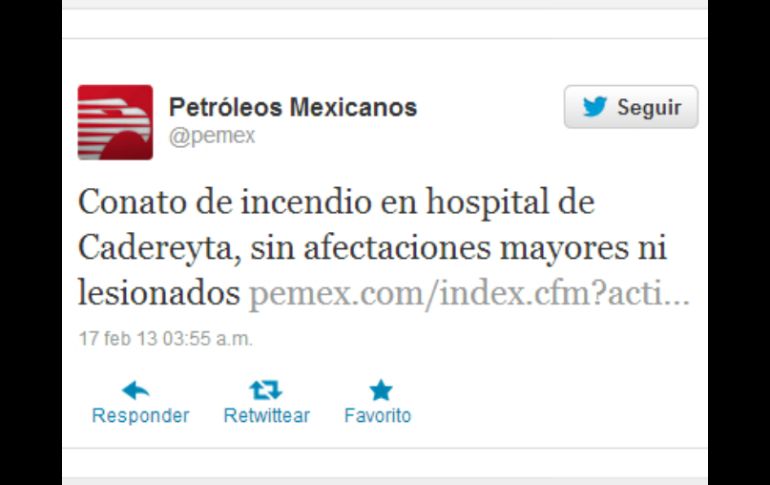 México | Según el reporte de Pemex, no hubo lesionados Controlan conato de incendio en hospital de Cadereyta Según el reporte de Pemex, no hubo lesionados Por: NTX 16 de febrero de 2013 - 21:39 hs Pemex dio a conocer la noticia a través de Twitter. TOMADA DE @pemex / MONTERREY, NUEVO LEÓN (16/FEB/2013).- Petróleos Mexicanos (Pemex) informó esta noche que fue controlado un conato de incendio que se registró en el área de terapia intensiva de su hospital de Cadereyta, el cual no causó daños mayores. En su cuenta de Twitter, la paraestatal publicó: "Desalojamos el área de terapia intensiva del hospital de Cadereyta en Nuevo León por un conato de incendio. No hubo lesionados". Por su parte, cuerpos de auxilio señalaron que el siniestro ocurrió alrededor de las 19:30 horas y en la zona del incidente se encontraban cuatro personas, las cuales de inmediato fueron evacuadas para su seguridad. Personal de Protección Civil del estado y municipal, así como de corporaciones policiales, lograron que en menos de 10 minutos fueran desalojadas todas las personas, entre pacientes y empleados del hospital de Pemex. De acuerdo con el reporte, los elementos de Bomberos de Nuevo León acudieron de inmediato al inmueble y lograron controlar el conato de incendio. Hasta el momento, las autoridades mantienen evacuado el hospital mientras llevan a cabo una evaluación de los daños y verificar las condiciones del edificio. Temas Pemex Incendios Estados Nuevo León Recibe las últimas noticias en tu e-mail Todo lo que necesitas saber para comenzar tu día Registrarse implica aceptar los Términos y Condiciones