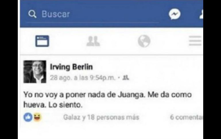 MÉRIDA, YUCATÁN (30/AGO/2016).- El director de Cultura del ayuntamiento de Mérida, Irving Berlín Villafaña, causó controversia en las redes sociales al escribir en su cuenta personal de Facebook que "le da hueva hablar de Juanga", en referencia a la reciente muerte del cantautor mexicano Juan Gabriel.Su desatinado comentario fue criticado severamente en las redes sociales, en donde fue bautizado como el "lord hueva".El funcionario municipal escribió en Facebook: "Yo no voy a poner nada de Juanga. Me da como hueva. Lo siento".Al ser cuestionado por los usuarios de las redes sociales, Berlín Villafaña optó por borrar su publicación, pero ya había sido capturada la imagen y difundida rápidamente.Mientras la clase política mexicana y artística ha lamentado el fallecimiento de Juan Gabriel, y hasta se anunció que Bellas Artes estará disponible para hacerle un homenaje, el funcionario del ayuntamiento de Mérida prefirió publicar que "le da hueva hablar de Juanga".Tras las fuertes críticas, el funcionario municipal reconoció a Juan Gabriel como un icono de la cultura de masas en México, incluso lo comparó con José Alfredo Jiménez y Agustín Lara, según una nueva publicación en Facebook.De hecho, Berlín Villafaña no descartó que en Mérida se realicen homenajes al fallecido cantautor.También pidió disculpas, justificándose: "Mis gustos personales en la música no tienen nada que ver con mi responsabilidad institucional... Quienes se hayan sentido lesionados por la difusión de un comentario privado, en una red, repito, donde solo están mis amigos, les externo mis disculpas".+Lee más noticias sobre la muerte de Juan Gabriel