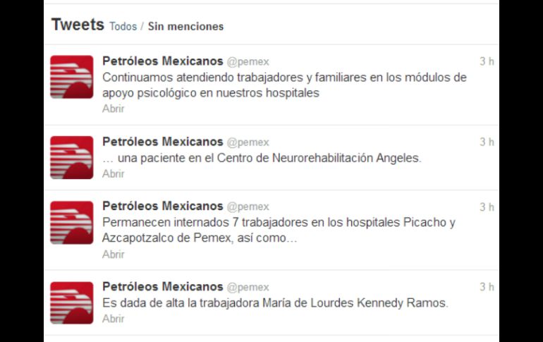 México | María de Lourdes Kennedy sale del hospital luego de la explosión en Pemex Dan de alta a trabajadora de Pemex María de Lourdes Kennedy sale del hospital luego de la explosión en el edificio B2 de Pemex Por: NTX 28 de febrero de 2013 - 21:36 hs Pemex da a conocer la noticia a través de su cuenta en Twitter. TOMADA DE @pemex / CIUDAD DE MÉXICO (28/FEB/2013).- Petróleos Mexicanos (Pemex) dio a conocer que fue dada de alta una trabajadora que estaba hospitalizada, quien resultó lesionada por la explosión ocurrida en su complejo administrativo, el pasado 31 de enero. A través de su cuenta de Twitter, la empresa informó que la trabajadora dada de alta fue María de Lourdes Kennedy Ramos; y señaló que otros siete empleados permanecen internados en sus hospitales de Picacho y Azcapotzalco y uno más en el Centro de Neurorehabilitación Angeles. Asimismo, agregó, que continúan atendiendo a trabajadores y familiares en los módulos de apoyo psicológico de sus hospitales. El pasado 31 de enero la acumulación de gas metano provocó una explosión en el edificio B2 de las instalaciones de la compañía. Temas Pemex Explosiones en el Distrito Federal Estados Recibe las últimas noticias en tu e-mail Todo lo que necesitas saber para comenzar tu día Registrarse implica aceptar los Términos y Condiciones