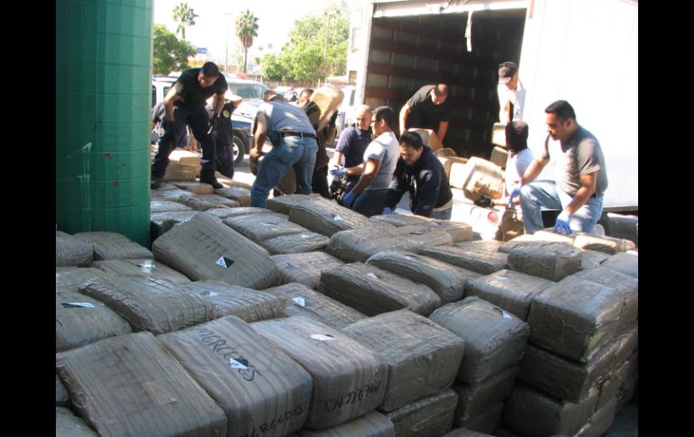 México | Policía informa que hay un detenido Decomisan 13 toneladas de mariguana en Tijuana En Manzanillo, Colima, la Armada de México y la Procuraduría estatal detuvieron en una casa de seguridad a dos presuntos integrantes del cártel de Sinaloa Por: SUN 2 de noviembre de 2010 - 02:30 hs Policías federales transportan la droga incautada a un sujeto en Tijuana, con un valor estimado en 519 millones de pesos. EL UNIVERSAL / TIJUANA, BAJA CALIFORNIA (02/NOV/2010).- Casi 13 toneladas de mariguana fueron incautadas por elementos de la Policía Estatal Preventiva (PEP) al detener a un sujeto en la colonia Buenos Aires Norte, en la delegación La Presa. Esto ocurre apenas dos semanas después del decomiso histórico de 105 toneladas de la droga en esta ciudad (18 de octubre), que en el mercado negro hubiesen generado unas 210 millones de dosis o en cuatro mil 200 millones de pesos. Por los primeros cálculos, la droga habría podido venderse en México en unas 25 millones de dosis o en 519 millones de pesos, pero si se comercializara en Estados Unidos el costo podría duplicarse y hasta triplicarse, dijo el jefe militar. El resultado se logró al atender una denuncia anónima sobre la realización de actividades ilícitas en la calle Mexicali, donde un hombre identificado como José Manuel Mercado Gallegos, de 53 años, cargaba un paquete de la hierba. El director de la PEP, Eusebio Alesio Villatoro Cortés, explicó que en la acción se incautaron dos vehículos donde al parecer era transportada la mariguana. De haberse vendido se habrían obtenido 25 millones 952 mil dosis de mariguana, y se hubieran obtenido ganancias por 519 millones 40 mil pesos, calculó el jefe policíaco. La incautación del enervante se logró cerca de las 01:00 horas de este lunes, mientras el detenido intentaba cargar uno de los camiones. Al observar a los agentes que habían acudido al llamado anónimo, Mercado Gallegos arrojó al piso un paquete que llevaba en las manos e intentó huir introduciéndose en un predio, donde se encontró el resto de la droga y dos vehículos con placas fronterizas que al parecer servirían para el transporte. Hasta el momento no se ha dado a conocer a cuál grupo criminal pertenecía la droga, pero trascendió que podría ser de integrantes del cártel “La Familia Michoacana”. Temas Crimen Organizado Tijuana Decomiso .Mariguana Recibe las últimas noticias en tu e-mail Todo lo que necesitas saber para comenzar tu día Registrarse implica aceptar los Términos y Condiciones