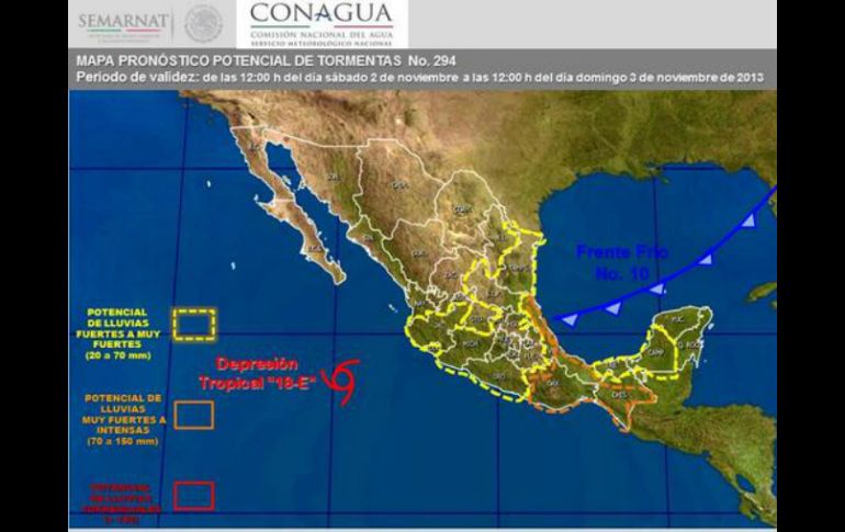 México | El Servicio Meteorológico informa que se acerca a Isla Socorro en Colima Depresión tropical ''18-E'' puede volverse tormenta 'Sonia' El Servicio Meteorológico informa que se acerca a Isla Socorro en Colima Por: NTX 2 de noviembre de 2013 - 14:02 hs El organismo espera que el fin de semana el fenómeno se aproxime hacia el sureste de la península de Baja California. NTX / CIUDAD DE MÉXICO (02/NOV/2013).- La depresión tropical "18-E" continúa acercándose a la Isla Socorro en Colima, por lo que existen condiciones para que la tarde de este sábado se convierta en tormenta tropical con el nombre de " Sonia". El Servicio Meteorológico Nacional (SMN) informó en su reporte más reciente que el fenómeno continúa trasladándose a siete kilómetros por hora, con vientos máximos sostenidos de 55 kilómetros por hora y rachas de hasta 75 kilómetros por hora. El organismo detalló que esta mañana el sistema se ubicó a 230 kilómetros al este-sureste de Isla Socorro, a 475 kilómetros al oeste-suroeste de La Fortuna, Jalisco, y a 595 kilómetros al sur de Cabo San Lucas, Baja California Sur. Con ello se generarán lluvias moderadas de 5 a 20 milímetros en Sinaloa, Baja California Sur y Durango, y fuertes de 20 a 50 milímetros en colima, Michoacán, Nayarit y Jalisco. Se espera que durante el fin de semana el fenómeno se aproxime hacia el sureste de la península de Baja California y el estado de Sinaloa, generando oleaje de dos a tres metros de altura conforme el sistema siga hacia el norte, acercándose a la costa. También se prevé que origine precipitaciones acumuladas durante las siguientes 72 horas, de 150 a 200 milímetros en Sinaloa y Sonora; de 100 milímetros en Baja California Sur y de 80 a 100 milímetros en Durango, valores que pueden variar de acuerdo con el comportamiento del sistema. Por otra parte, el frente frío número 10 incrementa la cantidad de nublados que podrían ocasionar lluvias de muy fuertes a intensas acompañadas de actividad eléctrica en Puebla, Hidalgo y Veracruz; así como fuertes en Tamaulipas, San Luis Potosí, Querétaro, Estado de México, Distrito Federal y Morelos. De acuerdo con el reporte del SMN, la masa de aire que impulsa al sistema frontal mantendrá ambiente frío durante la mañana y noche en los estados del norte, noreste y centro de México. También generará evento de Norte de moderado a fuerte con rachas de hasta 80 kilómetros por hora en las costas de Tamaulipas y Veracuz, y oleaje elevado, de dos a cuatro metros de altura, condiciones que podrían extenderse al resto del litoral en el transcurso de la tarde. El organismo de la Comisión Nacional del Agua (Conagua) informa sobre el desarrollo de esos fenómenos mediante la cuenta de Twitter @conagua_clima, la aplicación para teléfono celular MeteoInfo, así como los sitios de internet Conagua. Temas Conagua Estados Tormenta tropical SMN Recibe las últimas noticias en tu e-mail Todo lo que necesitas saber para comenzar tu día Registrarse implica aceptar los Términos y Condiciones