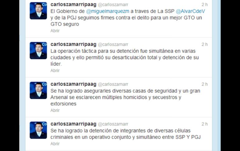 México | El procurador del estado informa que detuvieron a los integrantes y líder Desarticulan banda criminal en Guanajuato El procurador del estado informa que detuvieron a los integrantes y líder de la banda criminal Por: NTX 23 de febrero de 2013 - 21:32 hs El procurador Carlos Zamarripa, dio a conocer la información a través de Twitter. TOMADA DE @carloszamarr / LEÓN, GUANAJUATO (23/FEB/2013).- El procurador general de Justicia de Guanajuato, Carlos Zamarripa Aguirre, informó que tras una acción simultánea en varios municipios, se desarticuló una banda criminal que operaba en el estado, con la detención de sus integrantes y líder. A través de su cuenta de Twitter, el fiscal estatal indicó que se trata de integrantes de un grupo delictivo que operaba en varios municipios de la entidad, y en el operativo además se confiscó un arsenal y casas de seguridad. "Se ha logrado la detención de integrantes de diversas células criminales en un operativo conjunto y simultáneo entre SSP Y PGJ. La operación táctica para su detención fue simultánea en varias ciudades y ello permitió su desarticulación total y detención de su líder", escribió en esa red social. Por otra parte, la Secretaría de Seguridad Pública del estado dio a conocer que la noche de este sábado se registró el homicidio de un hombre de 35 años en el interior de un estacionamiento privado, ubicado en la calle Constancia, en la colonia Obregón. Señaló que con este asesinato suman ya 15 ejecuciones en la ciudad en lo que va del año, y el cuarto en los últimos cuatro días. Temas Estados Guanajuato Detenidos en México Recibe las últimas noticias en tu e-mail Todo lo que necesitas saber para comenzar tu día Registrarse implica aceptar los Términos y Condiciones