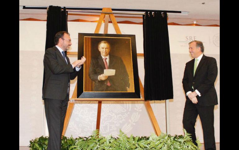 CIUDAD DE MÉXICO (24/AGO/2017).- La Cancillería mexicana develó la tarde de este jueves el retrato de José Antonio Meade en la galería de retratos de ex titulares.A través de sus redes sociales, la Secretaría de Relaciones Exteriores publicó una fotografía en donde se ve al canciller Luis Videgaray en compañía de Meade, quien ahora es secretario de Hacienda y Crédito Público.La víspera, Meade develó el retrato de Videgaray en la galería de ex secretarios de Hacienda, en Palacio Nacional.