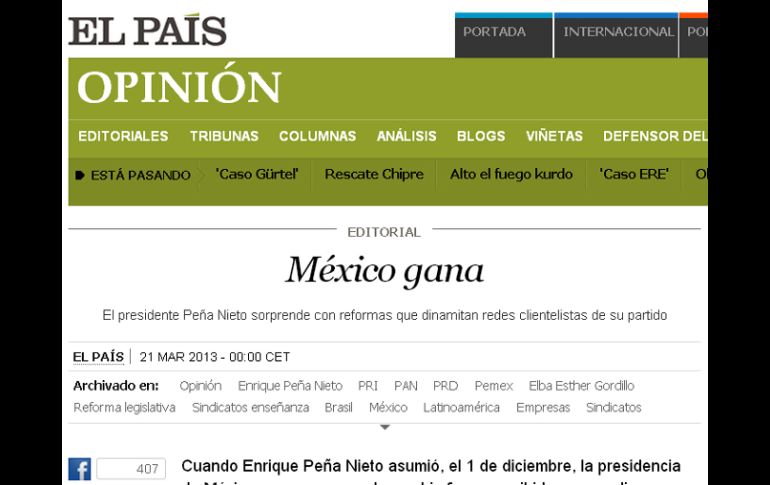 México | El rotativo asegura que el mandatario ''ha sorprendido con una batería de reformas'' Diario El País aplaude a Peña Nieto en editorial El País también indica que las reformas que se han presentado, la Educativa y la de Telecomunicaciones, atentan contra intereses sindicales o corporativos creados o captados en su día por el PRI Por: EL INFORMADOR 21 de marzo de 2013 - 11:02 hs l diario español El País publicó una editorial con el nombre ''México gana''. ESPECIAL / CIUDAD DE MÉXICO (21/MAR/2013).- El diario español El País publicó una editorial con el nombre “México gana” donde indica que los primeros tres meses de gobierno del Presidente Enrique Peña Nieto “ha sorprendido con una batería de reformas que tocan el nervio económico y político del país”. A pesar de que las promesas con las que llegó el Presidente de México fueron “recibidas con un ligero escepticismo”, y que en los 12 años que estuvo como oposición, se dedicó a bloquear las iniciativas modernizadoras de sus rivales políticos, ha logrado “enfrentarse a los poderes fácticos”. “No son medidas improvisadas. Han exigido previamente un cuidadoso trabajo político que ha fructificado en dos pasos históricos: una alianza nacional de los principales partidos —el Pacto por México— y el cambio de los estatutos del propio PRI, que ha liquidado sus esencias estatistas al extirpar, por ejemplo, el veto a la inversión privada en la petrolera pública Pemex”, dice uno de los diarios más importantes de habla hispana. El País también indica que las reformas que se han presentado, la Educativa y la de Telecomunicaciones, atentan contra intereses sindicales o corporativos creados o captados en su día por el PRI para mantenerse en el poder “en una red de clientelismo, burocracia y corrupción que ha lastrado el desarrollo de México.” “Quizás por eso solo este partido podía acometer la voladura controlada de esta estructura de poderes paralelos, con pericia política, pero también con mano de hierro”, dice. Finalmente cierra diciendo que México tiene todo que ganar. “El país merece, más que nunca, dirigentes políticos, empresariales y sociales a la altura de su potencial”. Temas Política Enrique Peña Nieto Medios de comunicación Lee También Hamás entrega cuatro cuerpos más de rehenes en Gaza "Trump puede ser presidente de la Paz o de la Guerra, pero no ambos": ministro iraní El audio de la soberbia Ni para la foto hubo acuerdo Recibe las últimas noticias en tu e-mail Todo lo que necesitas saber para comenzar tu día Registrarse implica aceptar los Términos y Condiciones