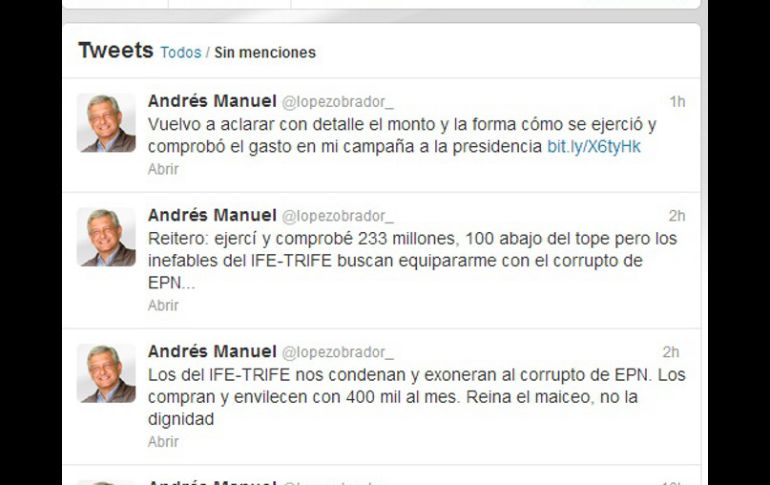 México | Andrés Manuel López Obrador señala: ''Reina el maiceo, no la dignidad'' El IFE aumenta multa a la izquierda por rebasar tope de campaña 2012 La coalición de la izquierdas, Movimiento Progresista deberá pagar una cifra superior a los 130 MDP Por: EL INFORMADOR 28 de junio de 2013 - 12:31 hs Andrés Manuel López Obrador se refiere a la disposición del IFE en su cuenta de Twitter. ESPECIAL / CIUDAD DE MÉXICO (28/JUN/2013).- La Unidad de Fiscalización del Instituto Federal Electoral (IFE) revelará este viernes el dictamen sobre el tope de las campañas presidenciales de las elecciones de julio de 2012, donde pretende emitir una multa para la coalición de la izquierdas, Movimiento Progresista, cuyo candidato fue Andrés Manuel López Obrador y estaba integrada por el Partido de la Revolución Democrática (PRD), Partido del Trabajo (PT) y Movimiento Ciudadano (MC). El documento señala que dicha coalición deberá pagar una cifra superior a los 130 millones de pesos, monto que es aún más alto al que el propio IFE había anunciado en enero pasado. Además expone que la colación Compromiso por México, compuesta por el Partido Revolucionario Institucional (PRI) y el Partido Verde Ecologista de México (PVEM), cuyo candidato y ganador de las elecciones fue Enrique Peña Nieto, también será multada por 54 millones 616 mil 826 pesos. Esa sanción no se impondrá por el rebase en los gastos de tope de campaña, sino por diversas irregularidades; el resto de esa multa es por que las campañas de los candidatos a diputados y senadores sí rebasaron el gasto establecido en la ley. Esta nueva resolución, que se entregará a las representaciones de los partidos y a los consejeros electorales, difieren de los datos revelados en enero del presente año en el que la Unidad de Fiscalización presentó al Consejo General del Instituto Federal Electoral la propuesta de multa a la coalición pro AMLO de 129 millones 829 mil 948 pesos por diversas irregularidades detectadas en los ingresos y egresos de la campaña presidencial y una multa a la coalición pro Peña Nieto por 54 millones 616 mil 826 pesos. Se anunció que el Consejo General del IFE someterá a discusión el documento el próximo martes, para determinar un dictamen final. Respecto a este informe, Andrés Manuel López Obrador dijo a través de su cuenta de Twitter (@lopezobrador_): “Los del IFE-TRIFE nos condenan y exoneran al corrupto de EPN. Los compran y envilecen con 400 mil al mes. Reina el maiceo, no la dignidad”. También reiteró: “Ejercí y comprobé 233 millones, 100 abajo del tope pero los inefables del IFE-TRIFE buscan equipararme con el corrupto de EPN…”. “Vuelvo a aclarar con detalle el monto y la forma cómo se ejerció y comprobó el gasto en mi campaña a la presidencia”, expuso, y colocó un link a una carta publicada el 29 de enero de este año. Carta íntegra Ciudad de México, 29 de enero de 2013 Aún cuando es evidente que los inefables del IFE pretenden equipararme con el corrupto de Enrique Peña Nieto y sus secuaces, estimo necesario aclarar a detalle el monto que recibimos, la forma cómo se ejerció y comprobó el gasto de mi campaña a la presidencia. 1. De conformidad ante la ley, antes de la campaña, los partidos PRD, PT y Movimiento Ciudadano suscribieron un convenio de coalición en el cual se acordó destinar el 50 % del financiamiento público para gastos de la campaña presidencial, equivalente a 223 millones 451 mil pesos. (Anexo convenio). Ver: Convenio 2. Estos recursos fueron entregados parcialmente por los partidos durante el periodo de campaña y manejados en la cuenta número 70034671344 de BANAMEX. 3. De esta forma el PRD aportó 112 millones 872 mil, el PT, 59 millones 049 mil y el Movimiento Ciudadano, 51 millones 531 mil. 4. Conviene aclarar que el PRD aportó adicionalmente 5 millones más un pasivo de 4 millones 979 mil pesos, debidamente documentados mediante contratos y facturas. 5. En total, el gasto de campaña que ejercimos fue de 233 millones 430 mil pesos. 6. Todo este gasto fue informado y comprobado mensualmente ante el IFE, a través del órgano de finanzas de la Coalición Movimiento Progresista. (Anexo informes). 7. Sin embargo, el dictamen del IFE, además de esta cantidad que representa 100 millones menos que el tope de campaña, nos agrega gastos que corresponden a las campañas de los candidatos a diputados y senadores, así como erogaciones que ejercieron centralmente los partidos integrantes de la Coalición. 8. De modo que es totalmente infundado como sostiene el IFE en su dictamen, que rebasé el tope de campaña establecido en la ley. Es obvio que toda esta maniobra tiene como propósito desprestigiarme y mandar el mensaje manipulador de que todos los políticos somos iguales, para seguir provocando el desánimo e inhibir la participación ciudadana que permita cambiar al régimen putrefacto de corrupción y privilegios que padecemos. Temas IFE PRD Política AMLO Lee También Anuncian 129 iniciativas de ley en el Congreso del Estado de México Cartucho “El Rey” Trump Pakistán y Afganistán acuerdan un cese al fuego Recibe las últimas noticias en tu e-mail Todo lo que necesitas saber para comenzar tu día Registrarse implica aceptar los Términos y Condiciones