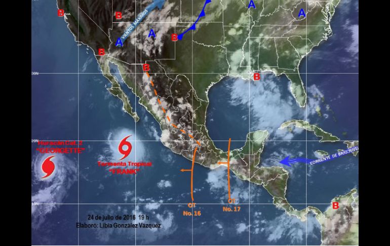 México | Se esperan chubascos con tormentas fuertes en todo el país para este lunes El SMN pronostica lluvias y tormentas intensas en el país Se esperan chubascos con tormentas fuertes en todo el país para la noche del domingo y este lunes Por: NTX 24 de julio de 2016 - 20:27 hs Las lluvias son provocadas por la tormenta tropical 'Frank', un canal de baja presión y las ondas tropicales números 16 y 17. ESPECIAL / smn.conagua.gob.mx CIUDAD DE MÉXICO (24/JUL/2016).- Un canal de baja presión localizado en el interior de México, las ondas tropicales números 16 y 17, ubicadas en el sur y el sureste del territorio nacional, y la tormenta tropical ' Frank', ubicada al suroeste de la Península de Baja California, provocarán lluvias en gran parte del país. El Servicio Meteorológico Nacional ( SMN) informó que se pronostican para las próximas horas es de chubascos fuertes con tormentas intensas en Oaxaca y Veracruz. Asimismo, chubascos con tormentas fuertes en Baja California Sur, Sonora, Chihuahua, Durango, Sinaloa, Nayarit, Jalisco, Colima, Michoacán, Guerrero, Estado de México, Ciudad de México, Morelos, Puebla, Hidalgo, Tabasco, Campeche, Yucatán y Quintana Roo. En un comunicado, el organismo dependiente de la Comisión Nacional del Agua (Conagua), indicó que también se prevén precipitaciones pluviales con chubascos en Nuevo León, Tamaulipas, San Luis Potosí, Zacatecas, Aguascalientes, Guanajuato, Querétaro y Tlaxcala. Además, lluvias escasas o lloviznas en Baja California y Coahuila, así como oleaje de dos a tres metros de altura en costa de Baja California Sur, Sinaloa y Nayarit. Destacó que a las 19:00 horas, 'Frank' se localizó aproximadamente a 245 kilómetros al oeste-noroeste de Isla Socorro, Colima, y 450 al suroeste de Cabo San Lucas, Baja California Sur, con desplazamiento al oeste-noroeste a nueve kilómetros por hora, vientos máximos sostenidos de 110 y rachas de hasta 140. Por otra parte, Georgette, huracán categoría dos en la escala Saffir-Simpson, se localiza aproximadamente a mil 810 kilómetros al oeste-suroeste de Cabo San Lucas, Baja California Sur, con desplazamiento al oeste-noroeste a 17, vientos máximos sostenidos de 165 y rachas de hasta 205. El SMN resaltó que este sistema se localiza lejos de costas nacionales por lo que no provocará efectos en México. Para este lunes, indicó que la Onda Tropical 17, ubicado en el sur del país, un canal de baja presión en el interior del territorio nacional y el ingreso de humedad del Océano Pacífico y del Golfo de México, ocasionarán chubascos fuertes con tormentas muy intensas en Oaxaca y Chiapas. Se esperan, señaló, chubascos con tormentas fuertes en Sonora, Chihuahua, Durango, Sinaloa, Nayarit, Jalisco, Colima, Michoacán, Guerrero, Morelos, Ciudad de México, Estado de México, Puebla y Veracruz. Se prevén lluvias con chubascos en Tamaulipas, San Luis Potosí, Zacatecas, Guanajuato, Querétaro, Hidalgo, Tlaxcala, Tabasco, Campeche y Quintana Roo; y escasas o lloviznas en Coahuila, Nuevo León, Aguascalientes y Yucatán. 'Frank' se localizará al suroeste de la Península de Baja California y sus desprendimientos nubosos ocasionarán lluvias con chubascos, así como oleaje de 2 a 3 metros de altura en costa de Baja California Sur, así como precipitaciones escasas o lloviznas en Baja California. En cuanto a temperaturas, se estiman valores superiores a 40 grados Celsius para Baja California, Sonora, Coahuila, Nuevo León, Tamaulipas, Campeche y Yucatán. Así como de 35 a 40 grados Celsius en Baja California Sur, Chihuahua, Durango, San Luis Potosí, Sinaloa, Nayarit, Jalisco, Colima, Michoacán, Guerrero, Oaxaca, Chiapas, Veracruz, Tabasco y Quintana Roo, y vientos con rachas de hasta 50 kilómetros por hora en Coahuila, Nuevo León, Tamaulipas, Campeche y Yucatán. La Conagua recomendó a la población extremar precauciones y mantenerse atenta a los avisos de Protección Civil y de las autoridades estatales y municipales, debido a que por las precipitaciones registradas en los últimos días, se reblandeció el suelo en algunas regiones, por lo que podría haber deslaves. También, deslizamientos de laderas, desbordamientos de ríos y arroyos o afectaciones en caminos y tramos carreteros, así como inundaciones en zonas bajas y saturación de drenajes en sitios urbanos. La Conagua y el SMN exhortaron a la población a mantenerse informada sobre las condiciones meteorológicas mediante la cuenta de twitter @conagua_clima y en las páginas de Internet http://smn.conagua.gob.mx y www.conagua.gob.mx Temas Fenómenos Naturales Conagua Estados Clima Tormenta tropical SMN Lluvias en el país Lee También Clima en Chapala hoy: el pronóstico para el domingo 12 de octubre de 2025 Clima en El Salto hoy: el pronóstico para el domingo 12 de octubre de 2025 Clima en Guadalajara hoy: el pronóstico para el domingo 12 de octubre de 2025 Clima en Mazamitla hoy: el pronóstico para el domingo 12 de octubre de 2025 Recibe las últimas noticias en tu e-mail Todo lo que necesitas saber para comenzar tu día Registrarse implica aceptar los Términos y Condiciones