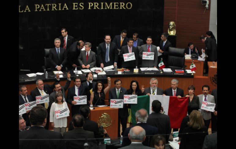 México | Senadores del PRI, PAN y PVEM dan su voto a favor mientras que el PRD en contra El Senado avala en lo general la reforma energética Senadores del PRI, PAN y PVEM dan su voto a favor en comisiones mientras que el PRD en contra Por: EL INFORMADOR 9 de diciembre de 2013 - 15:08 hs Legisladores del Sol Azteca se manifiestan en contra de la reforma desde la tribuna y piden una consulta popular. SUN / CIUDAD DE MÉXICO (09/DIC/2013).- Las comisiones unidas de Puntos Constitucionales, Energía y de Estudios Legislativos Primera del Senado aprobaron esta tarde en lo general el dictamen de la reforma energética que propone cambios a los artículos 25, 77 y 28 constitucionales. En el marco de la reanudación de esta sesión que se realiza con toma de tribuna por parte de senadores del PRD en el Salón de Plenos de la Comisión Permanente, se avaló por 24 votos a favor de los partidos Revolucionario Institucional (PRI), Acción Nacional (PAN) y Verde Ecologista de México (PVEM), así como nueve en contra de la Revolución Democrática (PRD) y del Trabajo (PT). Ahora vendrá la discusión de artículos reservados en lo particular, con el fin de subir hoy mismo el dictamen al pleno del Senado para su primera lectura. Con ello se espera que la reforma sea votada mañana por el pleno. El dictamen de Reforma Energética, que será discutido y avalado en lo particular, plantea diversos temas como la apertura de modelos contractuales para que la iniciativa privada pueda invertir en el sector de extracción de hidrocarburos. Asimismo se incluyen cambios constitucionales que permitirán que los particulares entablen contratos para explotar yacimientos a través de las figuras de la utilidad compartida y producción compartida, además del régimen de las licencias. Se señala que no estarán permitidas las concesiones, tanto en el sector petrolero como en el eléctrico. "Tratándose del petróleo y de los hidrocarburos sólidos, líquidos o gaseosos, en el subsuelo, la propiedad de la Nación es inalienable e imprescriptible y no se otorgarán concesiones", indica el dictamen. Después de la votación, el PRD reiteró su exigencia de realizar una consulta popular y acto seguido se retiraron de la tribuna, en donde estaban desde la mañana, hacia sus escaños. Anuncian reservas a los tres artículos Cabe destacar que en la discusión en lo particular se anunciaron reservas a los tres artículos constitucionales y a los 21 transitorios que contiene el dictamen de Reforma Energética. Previamente las comisiones unidas de Energía, Puntos Constitucionales y Estudios Legislativos Primera del Senado habían reanudado la sesión luego de un impasse de casi cuatro horas. Con información de El Universal y Notimex Temas Reforma Energética Cámara de Senadores Poder Legislativo Recibe las últimas noticias en tu e-mail Todo lo que necesitas saber para comenzar tu día Registrarse implica aceptar los Términos y Condiciones