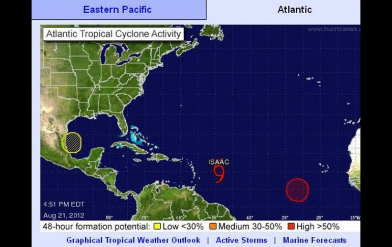 México | Representa peligro mínimo para la entidad, informan Emiten alerta azul en Quintana Roo por ''Isaac'' Protección Civil estatal dice que este sistema tropical está a 810 kilómetros al Este del Arco de las Antillas y vientos máximos sostenidos de 65 kilómetros por hora Por: SUN 21 de agosto de 2012 - 17:07 hs Imagen tomada del Centro Nacional de Huracanes de EU que muestra la posición de la tormenta tropical ''Isaac''. ESPECIAL / CHETUMAL, QUINTANA ROO (21/AGO/2012).- La depresión tropical número 9 evolucionó a la tormenta tropical ''Isaac'' en el Océano Atlántico, por lo que la entidad mantiene la alerta azul (peligro mínimo, acercamiento, aviso), informó Luis Carlos Rodríguez Hoy, director de Protección Civil estatal. Dijo que en la madrugada se formó la depresión tropical en base a un sistema de baja presión presente en el Atlántico, y este martes por la tarde alcanzó la categoría de tormenta tropical a la que le denominaron ''Isaac''. Informó que este sistema tropical está a 810 kilómetros al Este del Arco de las Antillas, con movimiento al Oeste a 28 kilómetros por hora y vientos máximos sostenidos de 65 kilómetros por hora. ''Atrás de este sistema también se ubica un área de baja presión que también está siendo monitoreada y presenta un alto porcentaje de evolucionar a un sistema ciclónico en las próximas horas'', apuntó. Debido a su distancia, ambos fenómenos meteorológicos no representan ningún riesgo para Quintana Roo; pero recomendó a la población en general estar atentos a los avisos que se emitirán a través del portal del gobierno del estado y por los diferentes medios de comunicación, sobre estos sistemas tropicales. Durante esta temporada de huracanes, la entidad ha sido afectada -en agosto- por el ciclón ''Ernesto'' con categoría uno en la escala Saffir Simpson y por la onda tropical número 11, que dejó más de 200 milímetros de lluvia en Chetumal, originando un caos en la vialidad, viviendas encharcadas y decenas de baches. Los meses de agosto, septiembre y octubre son de mucha actividad ciclónica en el Mar Caribe y el Océano Atlántico, apuntó Rodríguez Hoy. El 10 de agosto, la Comisión Nacional del Agua, informó que aumentó de 13 a 14 el pronóstico de ciclones tropicales para el Atlántico, Mar Caribe y Golfo de México para esta temporada de huracanes 2012. Temas Estados Quintana Roo Tormenta tropical Lee También Estados Unidos ataca embarcación en el Pacífico Estas son las ubicaciones de las próximas sucursales de Costco Embarazadas detenidas por el ICE denuncian condiciones inadecuadas Este día aparecería un nuevo ciclón en el Pacífico mexicano Recibe las últimas noticias en tu e-mail Todo lo que necesitas saber para comenzar tu día Registrarse implica aceptar los Términos y Condiciones