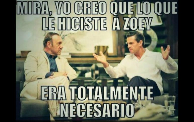 México | La foto de la reunión de EPN con Kevin Spacey es tomada con humor en redes sociales En redes sociales se mofan del encuentro Peña - Underwood La foto de la reunión de EPN con Kevin Spacey es tomada con humor en redes sociales Por: EL INFORMADOR 7 de mayo de 2014 - 21:50 hs En algunas de las imágenes, se hacen referencias a sucesos de la segunda temporada de la serie 'House of Cards'. ESPECIAL / CANCÚN, QUINTANA ROO (07/MAY/2014).- La foto de la reunión del Presidente de México, Enrique Peña Nieto tuvo una charla el actor Kevin Spacey, protagonista de la serie "House of Cards", ha sido intervenida con humor en las redes sociales. La popularidad del personaje Frank Underwood que encarna Spacey, generó viralidad de estas imágenes en Internet, al tiempo que algunos usuarios criticaron que el Mandatario se reúna con personajes del espectáculo y no con otras personalidades relevantes para la actualidad del país. En algunas de las imágenes publicadas en tono de burla, se hacen referencias a sucesos de la segunda temporada de la serie que está disponible a través del servicio de video en línea, Netflix. En otras publicaciones, los usuarios se mofan del escaso dominio del inglés de Peña Nieto y recrean supuestas frases que pudo haber dicho durante el encuentro con el actor de "House of Cards". Temas Curiosidades y absurdos Enrique Peña Nieto Kevin Spacey Redes Sociales Lee También ¿Por qué duelen las manos cuando hace frío? Lo MEJOR que se debe hacer con un celular mojado Estos son los riesgos de tener una vida sedentaria Así ha bajado la afiliación de trabajadoras del hogar en el IMSS Recibe las últimas noticias en tu e-mail Todo lo que necesitas saber para comenzar tu día Registrarse implica aceptar los Términos y Condiciones