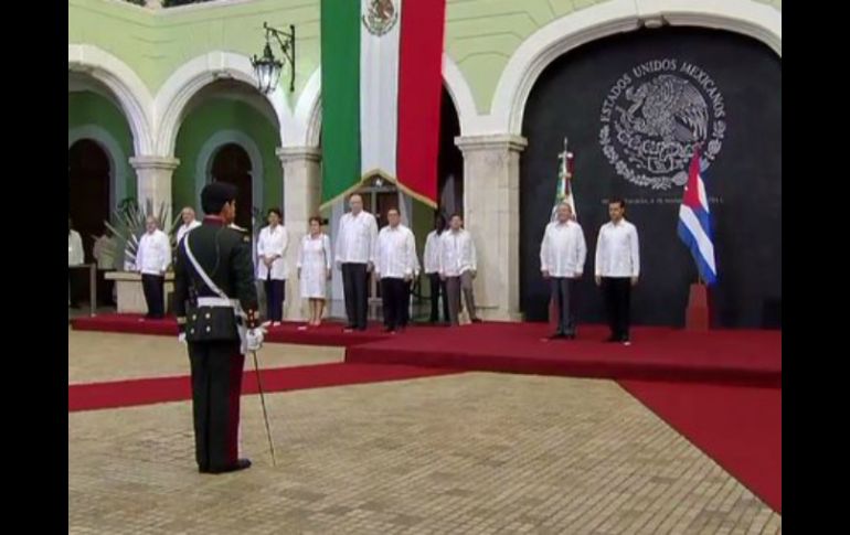 México | El presidente de Cuba se encuentra en México en visita oficial Enrique Peña Nieto ofrece bienvenida oficial a Raúl Castro Ruz Es la primera visita de Estado que el mandatario cubano hace a territorio mexicano desde que asumió la presidencia de su país Por: NTX 6 de noviembre de 2015 - 10:32 hs MÉRIDA, YUCATÁN (06/NOV/2015).- El Presidente Enrique Peña Nieto recibió a su homólogo de Cuba, Raúl Castro Ruz, quien realiza su primer visita de Estado a México. En el acto protocolario en Palacio de Gobierno se entonaron los himnos nacionales de ambos países, se presentaron las comitivas oficiales y el presidente de los Consejos de Estado y de Ministros de la República de Cuba, Raúl Castro pasó revista a las tropas de honor. En esta ceremonia, acompañaron al presidente de México, los secretarios de Gobernación, Miguel Ángel Osorio Chong; de Relaciones Exteriores, Claudia Ruiz Massieu; de Economía, Ildefonso Guajardo; de Agricultura, Ganadería, Desarrollo Rural, Pesca y Alimentación, Eduardo Calzada Rovirosa. También los titulares de las secretarías de Turismo, Enrique de la Madrid Cordero, y de Educación, Aurelio Nuño; el jefe de la Oficina de la Presidencia de la República, Francisco Guzmán Ortiz; el gobernador de Yucatán, Rolando Zapata Bello, y en representación del Poder Legislativo, el diputado federal José Luis Toledo Medina, secretario de la Comisión de Turismo de la Cámara de Diputados. Al término del acto protocolario, los presidentes Peña Nieto y Castro Ruz se trasladaron al salón de Historia de este recinto para tomarse la fotografía oficial del encuentro. Después, se dirigieron al despacho del gobernador Zapata Bello, donde Peña Nieto y Castro Ruz sostuvieron una reunión privada e intercambiaron obsequios y condecoraciones, antes de dirigirse a atestiguar la firma de diversos convenios. En enero 2013, el Presidente Peña Nieto se reunió con el general Raúl Castro, en el marco de la Primera Cumbre de la CELAC, en Chile, y ambos acordaron el relanzamiento de la relación, que se formalizó el 1 de noviembre de ese año, con la suscripción de nueve instrumentos que actualizaron el marco jurídico bilateral. Temas Gobierno de México SRE Cuba Enrique Peña Nieto Raúl Castro Recibe las últimas noticias en tu e-mail Todo lo que necesitas saber para comenzar tu día Registrarse implica aceptar los Términos y Condiciones