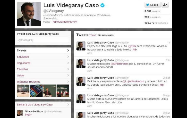 México | Asegura que el proceso electoral llega a su fin y el mexiquense será Presidente Es momento de trabajar para cumplirle a México: Videgaray A su vez, el PRI asegura que con su candidato presidencial Enrique Peña Nieto ganó México Por: NTX 30 de agosto de 2012 - 21:29 hs A través de su cuenta de Twitter, Luis Videgaray expresa que Peña Nieto será Presidente. ESPECIAL / CIUDAD DE MÉXICO (30/AGO/2012).- El coordinador de Políticas Públicas del equipo de Enrique Peña Nieto, Luis Videgaray, expresó que es momento de trabajar para cumplirle a México. Mientras se desarrollaba la sesión del Tribunal Electoral del Poder Judicial de la Federación (TEPJF) donde se discutía la impugnación a la elección presidencial, aseguró que el proceso electoral llega a su fin y el mexiquense sería Presidente. A través de su cuenta de Twitter @LVidegaray, anotó: ''el proceso electoral llega a su fin. @EPN será Presidente. Ahora a trabajar para cumplirle a todo México''. A su vez, el Partido Revolucionario Institucional (PRI) aseguró que con su candidato presidencial Enrique Peña Nieto ganó México. En Twitter, mediante @PRI_Nacional, señaló: ''#EPNpresidenteElecto Ganó México, nos une México''. Temas Enrique Peña Nieto TEPJF Elecciones México 2012 Lee También Lista actualizada de selecciones que ya clasificaron al Mundial 2026 La edad de riesgo de padecer un trastorno mental, según expertos Esta es la ubicación de las presas que abastecen al Sistema Cutzamala México reacciona a acuerdo de paz entre Israel y Hamás Recibe las últimas noticias en tu e-mail Todo lo que necesitas saber para comenzar tu día Registrarse implica aceptar los Términos y Condiciones