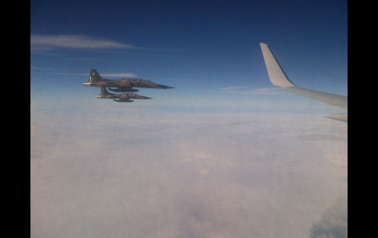 México | El Presidente realiza su última gira internacional Escoltan cazas a Calderón en viaje aéreo Durante la escolta de honor que realizó la Secretaría de la Defensa Nacional y Fuerza Aérea el presidente Calderón conversó con el comandante responsable Por: SUN 15 de noviembre de 2012 - 13:50 hs Dos aviones de la Fuerza Aérea Mexicana escoltaron este jueves el avión presidencial. NOTIMEX / CIUDAD DE MÉXICO (15/NOV/2012).- Dos aviones de la Fuerza Aérea Mexicana escoltaron este jueves el avión presidencial con motivo de la última gira de trabajo internacional del Presidente Felipe Calderón en el marco de la XXII Cumbre Iberoamericana que se realizará en Cádiz, España, informó la Presidencia de la República en un comunicado. Durante la escolta de honor que realizó la Secretaría de la Defensa Nacional y Fuerza Aérea el presidente Calderón conversó con el comandante responsable y expresó el orgullo y aprecio que le tiene el pueblo de México a su Fuerza Aérea, de acuerdo con el breve comunicado. El Presidente Calderón "aprovechó también la oportunidad para solicitar a los pilotos que, en su nombre, feliciten a todos sus compañeros con motivo del Día del Piloto Aviador Militar que se celebra el día de hoy". El comandante militar al mando de la escolta de honor expresó que ha sido un honor servir a México y al Presidente Calderón en estos seis años de su gobierno, ante lo cual el jefe máximo de las fuerzas armadas reconoció la labor y lealtad de la Fuerza Aérea Mexicana. Temas Gobierno de México Felipe Calderón Lee También Clima en Ciudad de México hoy: el pronóstico para el sábado 11 de octubre de 2025 Hoy No Circula Sabatino: Autos que descansan este 11 de octubre en CDMX y Edomex CURP biométrica : ¿Dónde sacar cita para el trámite en CDMX? Detienen a Lex Ashton 'N' por homicidio y tentativa de homicidio Recibe las últimas noticias en tu e-mail Todo lo que necesitas saber para comenzar tu día Registrarse implica aceptar los Términos y Condiciones
