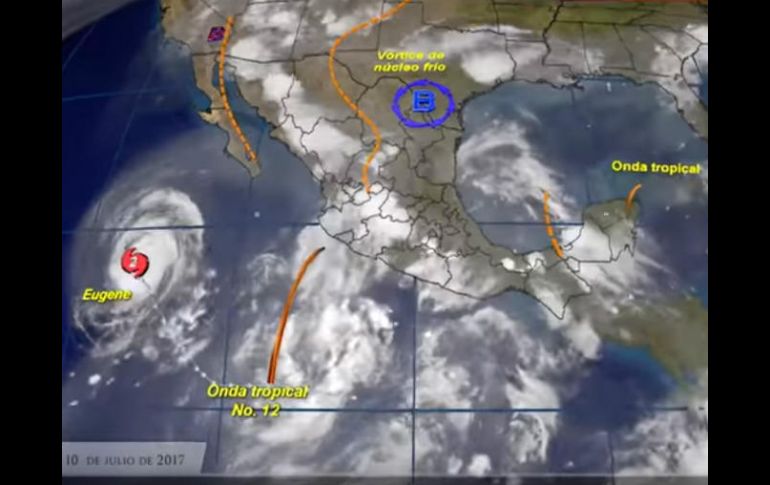 CIUDAD DE MÉXICO (10/JUL/2017).- El huracán ''Eugene'', ubicado al oeste-suroeste de la península de Baja California, disminuyó a categoría I en la escala Saffir-Simpson y continúa su alejamiento del país con desplazamiento hacia el noroeste a 17 kilómetros por hora.El Servicio Meteorológico Nacional informó que se encuentra a 890 kilómetros al oeste-suroeste de Cabo San Lucas, Baja California Sur, y a 660 kilómetros al oeste de Isla Socorro, en Colima.De acuerdo con el reporte más reciente, el fenómeno meteorológico, que no afecta a territorio nacional, registra vientos sostenidos de 140 kilómetros por hora y rachas de 165 kilómetros por hora.De acuerdo con el pronóstico, el huracán se encontrará a las 19:00 horas de hoy a 765 kilómetros al oeste de Isla Socorro, Colima, y a 800 al suroeste de Cabo San Lázaro, Baja California Sur.